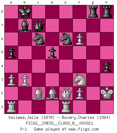 Last move : 0-1 2020 May 23 21:29:46 [Event "FICGS__CHESS__CLASS_B__000321"] [Site "FICGS"] [Date "2020.03.28"] [Round "1"] [White "Vellema,Jelle"] [Black "Bovary,Charles"] [Result "0-1"] [WhiteElo "1878"] [BlackElo "1964"] 1.d4 Nf6 2.Nf3 e6 3.e3 b6 4.Bd3 Bb7 5.O-O c5 6.Nbd2 d5 7.c3 Nc6 8.Qe2 Bd6 9.e4 Be7 10.e5 Nd7 11.a3 a5 12.Re1 g5 13.c4 Nf8 14.cxd5 exd5 15.dxc5 bxc5 16.h3 h5 17.Nf1 g4 18.N3h2 gxh3 19.Ng3 Ne6 20.Nf5 hxg2 21.Nf3 h4 22.Kxg2 c4 23.Bc2 Qc7 24.Kh2 O-O-O 25.Bd2 Kb8 26.b3 c3 27.Bxc3 Rdg8 28.Bd2 f6 29.Nxe7 Qxe7 30.exf6 Qc7+ 0-1 Queen's pawn : Yusupov-Rubinstein system Kingside Castling by player White (move 5) Queenside Castling by player Black (move 24) Player Black won this chess game. Follow this game move after move (download)Chess is a foolish expedient for making idle people believe they are doing something very clever when they are only wasting their time. (George Bernard Shaw) Später, ... hatte ich zunehmend Erfolg in entscheidenden Partien. Vielleicht weil ich eine einfache Wahrheit erkannte: nicht nur ich hatte Angst, auch mein Gegner. (Mikhail Nekhemyevich Tal) El Ajedrez es como la guerra en un tablero. (Bobby Fischer) La vie et les Echecs sont tous les deux une lutte constante. (Lasker) The Internet is the world's largest library. It's just that all the books are on the floor. (John Allen Paulos)