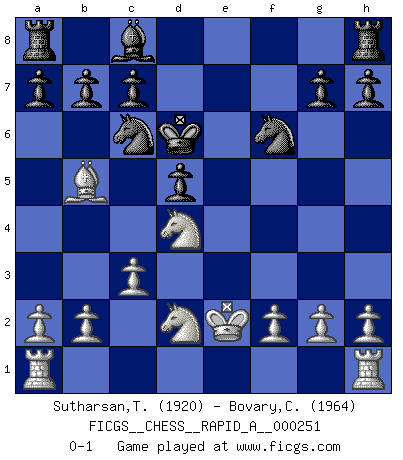Last move : 0-1 2020 June 18 12:21:48 [Event "FICGS__CHESS__RAPID_A__000251"] [Site "FICGS"] [Date "2020.04.03"] [Round "1"] [White "Sutharsan,Thirunathan"] [Black "Bovary,Charles"] [Result "0-1"] [WhiteElo "1920"] [BlackElo "1964"] 1.e4 e5 2.Nf3 Nc6 3.d4 exd4 4.Bc4 Nf6 5.e5 Ng4 6.Qe2 Qe7 7.Bf4 f6 8.exf6 Nxf6 9.Nbd2 d5 10.Bb5 Qxe2+ 11.Kxe2 Bb4 12.Nxd4 Kd7 13.c3 Bd6 14.Bxd6 Kxd6 0-1 This chess game has been lost on time (started : 2020.04.03 15:16:41) Scotch gambit : Dubois-Reti defense Player Black won this chess game. Follow this game move after move (download)A passed Pawn increases in strength as the number of pieces on the board diminishes. (Capablanca) Dass jemand wie Surab Asmaiparaschwili, der selbst Elopunkte gekauft hat , Vize-Präsident der Fide werden konnte, sagt schon einges über den Zustand dieser Organisation aus. (Joel Lautier) El poder defensivo de una pieza clavada, solamente es imaginario. (Aaron Nimzovich) Aucun coup ne doit être joué sans but. (Pedro Damiano) The beginning is the most important part of the work. (Plato)
