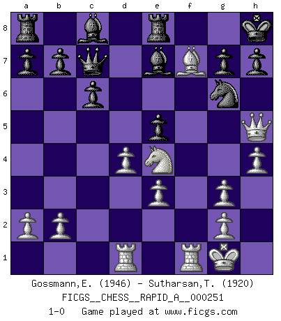 Last move : 1-0 2020 May 22 7:47:48 [Event "FICGS__CHESS__RAPID_A__000251"] [Site "FICGS"] [Date "2020.04.03"] [Round "1"] [White "Gossmann,Ewald"] [Black "Sutharsan,Thirunathan"] [Result "1-0"] [WhiteElo "1946"] [BlackElo "1920"] 1.d4 Nf6 2.c4 e6 3.Nc3 d5 4.Bg5 Be7 5.Nf3 c6 6.e3 Nbd7 7.Qc2 O-O 8.Rd1 Re8 9.Bf4 Nf8 10.Be2 Ng6 11.Bg3 Qa5 12.O-O dxc4 13.Bxc4 Nh5 14.h4 Nxg3 15.fxg3 Bd6 16.Qf2 Qc7 17.Ne4 Bf8 18.Nfg5 f6 19.Qf5 fxg5 20.Qxg5 Kh8 21.Qg4 e5 22.Qh5 Be7 23.Bf7 1-0 Queen's pawn game Kingside Castling by player Black (move 7) Kingside Castling by player White (move 12) Player White won this chess game. Follow this game move after move (download)The most powerful weapon in Chess is to have the next move. (David Bronstein) Warum muß ich gegen diesen IDIOTEN verlieren? (Aaron Nimzowitsch) Yo no creo en la psicología. Yo creo en las buenas movidas. (Bobby Fischer) Que feriez-vous si vous étiez en train de jouer aux échecs et que la fin du monde arrive ? Je continuerais à jouer. (Saint Borromée) Begin at the beginning and go on till you come to the end; then stop. (Lewis Carrol, Alice in Wonderland)
