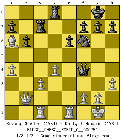 Last move : 1/2-1/2 2020 May 12 8:5:26 [Event "FICGS__CHESS__RAPID_A__000251"] [Site "FICGS"] [Date "2020.04.03"] [Round "1"] [White "Bovary,Charles"] [Black "Kuliy,Oleksandr"] [Result "1/2-1/2"] [WhiteElo "1964"] [BlackElo "1981"] 1.d4 d5 2.c4 e6 3.Nf3 Nf6 4.Nc3 Bb4 5.Bg5 Nbd7 6.e3 c5 7.Rc1 Qa5 8.Nd2 cxd4 9.exd4 O-O 10.Be2 Bxc3 11.bxc3 b6 12.O-O Ba6 13.a4 dxc4 14.Bxf6 Nxf6 15.Nxc4 Bxc4 16.Bxc4 Rac8 17.Qb3 Rfd8 18.Rfe1 Qf5 19.h3 Qf4 20.Ba6 Rc7 21.Qb2 1/2-1/2 Queen's gambit declined Kingside Castling by player Black (move 9) Kingside Castling by player White (move 12) This chess game ended in a draw. Follow this game move after move (download)In the perfect Chess combination as in a first-rate short story, the whole plot and counter-plot should lead up to a striking finale, the interest not being allayed until the very last moment. (Yates and Winter) Ich bin Weltmeister und muß mit niemandem irgend etwas diskutieren. (Viswanathan Anand) Por la belleza de sus partidas, la claridad de su juego y lo brillante de sus ideas, Fischer se creó el mismo como un artista de la misma estatura como Brahms, Rembrandt y Shakespeare. (David Levy) Il a essayé de se convaincre qu'il pourrait empêcher toutes les erreurs et ne jamais perdre. L'horreur ! Gary Kasparov au sujet de Robert Fischer. He who fights with monsters should be careful lest he thereby become a monster. (Friedrich Nietzsche, Beyond Good and Evil)