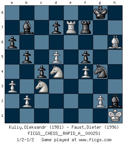 Last move : 1/2-1/2 2020 May 5 16:10:44 [Event "FICGS__CHESS__RAPID_A__000251"] [Site "FICGS"] [Date "2020.04.03"] [Round "1"] [White "Kuliy,Oleksandr"] [Black "Faust,Dieter"] [Result "1/2-1/2"] [WhiteElo "1981"] [BlackElo "1996"] 1.d4 f5 2.c4 Nf6 3.Nc3 b6 4.e3 Bb7 5.f3 e6 6.Bd3 c5 7.Nge2 Nc6 8.O-O Bd6 9.d5 Ne5 10.e4 O-O 11.exf5 Nxd3 12.Qxd3 exd5 13.cxd5 Qc7 14.Kh1 Rae8 15.Bg5 c4 16.Qd2 Bxh2 17.f4 Ng4 18.f6 gxf6 19.Bh4 f5 20.Rf3 Qc5 21.a3 b5 22.Nd4 a6 23.Bf2 Qc7 24.Rf1 Qb8 25.Bh4 Re3 26.Bg5 Qe8 27.Rxe3 Qxe3 28.Qxe3 Nxe3 29.Re1 Ng4 30.Re7 h6 31.Bxh6 Rf7 1/2-1/2 Dutch with c4 & Nc3 Kingside Castling by player White (move 8) Kingside Castling by player Black (move 10) This chess game ended in a draw. Follow this game move after move (download)Becoming successful at Chess allows you to discover your own personality. That's what I want for the kids I teach. (Saudin Robovic) Die unerbitterlichsten Regeln im Schach sind die Ausnahmen. (Savielly Grigorievitsch Tartakower) El Ajedrez es 99 por ciento táctica. (Teichmann) Dans le domaine de la peinture, de la gravure et de la sculpture, dès la première décennie de notre siècle, les artistes abandonnent la représentation de la partie d'échecs pour se concentrer sur les pièces, sur les échiquiers et sur toutes les variations auxquelles les unes et les autres peuvent donner lieu. On passe en quelque sorte d'un thème social à un thème musical (au sens de la musica médiévale, c'est-à-dire d'une notion qui inclue le rythme, l'harmonie, la construction et la déconstruction, etc.). Graphiquement et picturalement, l'échiquier apparaît comme une structure ouverte, dynamique, d'une richesse infinie, autorisant toutes les combinatoires et débouchant sur des mouvements et des rythmes de nature exponentielle. (Michel Pastoureau) The absolute truth is the thing that makes people laugh. (Carl Reiner)