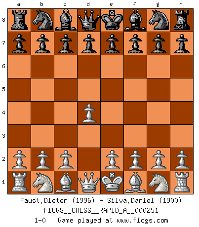 Last move : 1-0 2020 May 4 4:38:18 [Event "FICGS__CHESS__RAPID_A__000251"] [Site "FICGS"] [Date "2020.04.03"] [Round "1"] [White "Faust,Dieter"] [Black "Silva,Daniel"] [Result "1-0"] [WhiteElo "1996"] [BlackElo "1900"] 1.d4 1-0 This chess game has been lost on time (started : 2020.04.03 15:16:41) Queen's pawn Player White won this chess game. Follow this game move after move (download)All my games are real. (Bobby Fischer) Wenn ich Weiß habe gewinne ich weil ich Weiß habe, wenn ich Schwarz habe gewinne ich weil ich Bogoljubov bin. (Efim Bogoljubov) En el tablero, la mentira e hipocresía no sobreviven mucho. (Emanuel Lasker) Les échecs, c'est l'imagination. (David Bronstein) To err is human, to shift the blame on someone else is tactical. (Mladen Jankovic)