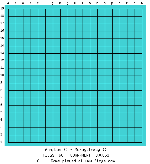 Last move : 0-1 2020 May 4 4:38:18 [Event "FICGS__GO__TOURNAMENT__000063"] [Site "FICGS"] [Date "2020.04.03"] [Round "1"] [Black "Anh,Lan"] [White "Mckay,Tracy"] [Result "0-1"] 0-1 This go game has been lost on time (started : 2020.04.03 18:33:56) Here are the names of the openings (joseki) played in the four corners : Player White won this Go (weiqi, baduk) game. Follow this game move after move (download)Do not make moves that strengthen your opponent ! (Anonymous) Sometimes it pays to stay in bed in Monday, rather than spending the rest of the week debugging Monday's code. (Dan Salomon)