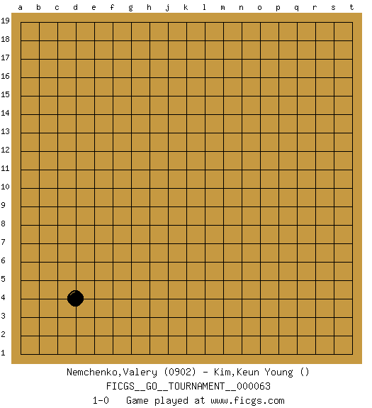 Last move : 1-0 2020 May 4 4:38:18 [Event "FICGS__GO__TOURNAMENT__000063"] [Site "FICGS"] [Date "2020.04.03"] [Round "1"] [Black "Nemchenko,Valery"] [White "Kim,Keun Young"] [Result "1-0"] [Rating 1 "0902"] 1.d4 1-0 This go game has been lost on time (started : 2020.04.03 18:33:56) Here are the names of the openings (joseki) played in the four corners : Corner d4 : d4 1-0 Hoshi (Hwajeom, Seongjeom, Xingwei`) 4-4 Point. The star or hoshi (4-4) point, emphasizing influence at the potential expense of territory. Player Black won this Go (weiqi, baduk) game. Follow this game move after move (download)Every move brings change. (Pierre Audouard) O divine art of subtlety and secrecy! Through you we learn to be invisible, through you inaudible and hence we can hold the enemy's fate in our hands. (Sun Tzu)