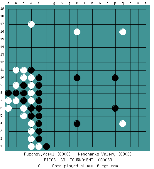 Last move : 0-1 2020 June 12 1:48:11 [Event "FICGS__GO__TOURNAMENT__000063"] [Site "FICGS"] [Date "2020.04.03"] [Round "1"] [Black "Puzanov,Vasyl"] [White "Nemchenko,Valery"] [Result "0-1"] [Rating 1 "0000"] [Rating 2 "0902"] 1.k10 q16 2.p10 q4 3.k4 d4 4.e10 d17 5.p6 k16 6.d5 c5 7.d6 c6 8.c7 b7 9.b8 a6 10.e4 d3 11.e3 d2 12.e2 e1 13.f1 d1 14.a8 a7 15.c8 d7 16.e7 d8 17.e8 d9 18.c9 d10 19.e5 c10 20.e9 b9 21.e6 b11 22.d11 c11 0-1 This go game has been lost on time (started : 2020.04.03 18:33:56) Here are the names of the openings (joseki) played in the four corners : Corner q4 : q4 p6 Hoshi (Hwajeom, Seongjeom, Xingwei`) 4-4 Point. The star or hoshi (4-4) point, emphasizing influence at the potential expense of territory. Corner d4 : d4 d5 Hoshi (Hwajeom, Seongjeom, Xingwei`) 4-4 Point. The star or hoshi (4-4) point, emphasizing influence at the potential expense of territory. Player White won this Go (weiqi, baduk) game. Follow this game move after move (download)In opponents' sphere of influence, avoid sharp conflict, don't move too deep. (Otake Hideo, 9p) If only faces could talk... (Pat Summerall, Sportscaster during the Super Bowl)