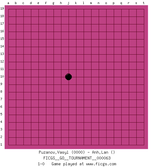 Last move : 1-0 2020 May 6 7:34:28 [Event "FICGS__GO__TOURNAMENT__000063"] [Site "FICGS"] [Date "2020.04.03"] [Round "1"] [Black "Puzanov,Vasyl"] [White "Anh,Lan"] [Result "1-0"] [Rating 1 "0000"] 1.j10 1-0 This go game has been lost on time (started : 2020.04.03 18:33:56) Here are the names of the openings (joseki) played in the four corners : Player Black won this Go (weiqi, baduk) game. Follow this game move after move (download)When your opponent has two weak groups, attack them both at once. (Anonymous) Whatever you do, don't be bored. This is absolutely the most exciting time we could have possibly hoped to be alive. And things are just starting. (From movie Waking life)