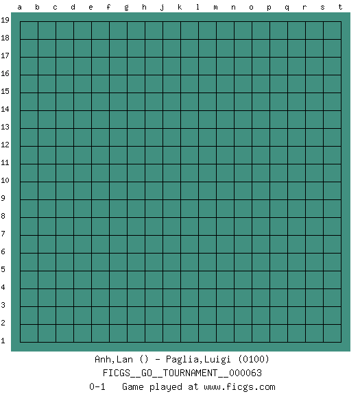 Last move : 0-1 2020 May 4 4:38:18 [Event "FICGS__GO__TOURNAMENT__000063"] [Site "FICGS"] [Date "2020.04.03"] [Round "1"] [Black "Anh,Lan"] [White "Paglia,Luigi"] [Result "0-1"] [Rating 2 "0100"] 0-1 This go game has been lost on time (started : 2020.04.03 18:33:56) Here are the names of the openings (joseki) played in the four corners : Player White won this Go (weiqi, baduk) game. Follow this game move after move (download)Don't overlook the edge of the board. (Anonymous) The best teachers teach from the heart, not from the book. (Author unknown)