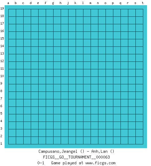 Last move : 0-1 2020 May 4 4:38:18 [Event "FICGS__GO__TOURNAMENT__000063"] [Site "FICGS"] [Date "2020.04.03"] [Round "1"] [Black "Campusano,Jeangel"] [White "Anh,Lan"] [Result "0-1"] 0-1 This go game has been lost on time (started : 2020.04.03 18:33:56) Here are the names of the openings (joseki) played in the four corners : Player White won this Go (weiqi, baduk) game. Follow this game move after move (download)Five groups might live but the six will die. (Anonymous) Life is verb, not a noun. (Charlotte Perkins Gilman)