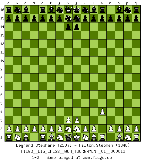 Last move : 1-0 2020 April 3 19:39:38 [Event "FICGS__BIG_CHESS__WCH_TOURNAMENT_01__000013"] [Site "FICGS"] [Date "2020.04.03"] [Round "1"] [White "Legrand,Stephane"] [Black "Hilton,Stephen"] [Result "1-0"] [WhiteElo "2297"] [BlackElo "1348"] 1.m2-m4 1-0 Follow this game move after move (download)The mistakes are there, waiting to be made. (Savielly Tartakower) Frage des Reporters: -Welche besonderen Umstände rechtfertigen das Anhalten der Uhren während einer Turnierpartie? Antwort: -Einen Fotographen zu strangulieren. (Siegbert Tarrasch) Un jugador que es sorprendido, esta derrotado a medias. (Proverbio) Karpov est une pièce de musée. (Garry Kasparov) Games, world of games... There's always an opponent, and there's always a victim. (Revolver, movie)