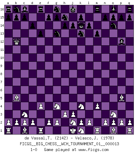 Last move : 1-0 2020 May 18 3:9:1 [Event "FICGS__BIG_CHESS__WCH_TOURNAMENT_01__000013"] [Site "FICGS"] [Date "2020.04.03"] [Round "1"] [White "de Vassal,Thibault"] [Black "Velasco,Jose Maria"] [Result "1-0"] [WhiteElo "2142"] [BlackElo "1978"] 1.j2-k4 h15-g13 2.h2-g4 j15-k13 3.h1-o7 m15-m13 4.m2-m4 l16-p12 5.e2-e4 e15-e13 6.l1-p5 k16-h15 7.p1-o3 p16-o14 8.b1-c3 f16-b12 9.g1-j2 d15-d14 10.f1-b5 l15-l14 11.o7-p6 h16-o10 12.p6-b6 o10-k14 13.b6-b12 1-0 This big chess game has been lost on time (started : 2020.04.03 19:3:27) Follow this game move after move (download)It's just you and your opponent at the board and you're trying to prove something. (Bobby Fischer) Ich möchte Schüler heranbilden, die das Vermögen haben, selbst zu denken und Kritik zu üben. (Emanuel Lasker) Un entendimiento a fondo de las continuaciones típicas del mate, hace de las combinaciones de sacrificio mas complicadas conducirlas a ellas no solo sin dificultad, sino casi de una manera natural. (Siegbert Tarrasch) Un footballeur joue avec ses pieds, parfois avec sa tête. Un joueur d'échecs ne joue qu'avec sa tête. Et quand il ne joue plus, il meurt. (Jacob Murray) The intuitive mind is a sacred gift; the rational mind is a faithful servant. We have created a society that honors the servant but has forgotten the gift. (Albert Einstein)