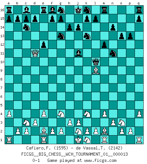 Last move : 0-1 2020 April 26 9:29:48 [Event "FICGS__BIG_CHESS__WCH_TOURNAMENT_01__000013"] [Site "FICGS"] [Date "2020.04.03"] [Round "1"] [White "Cafiero,Florian"] [Black "de Vassal,Thibault"] [Result "0-1"] [WhiteElo "1595"] [BlackElo "2142"] 1.j2-k4 h15-g13 2.n2-n3 j15-k13 3.h2-g4 h16-o10 4.p1-o3 m15-m13 5.d2-d3 l16-p12 6.o1-j6 p16-o14 7.m2-m4 n15-n14 8.e2-e4 o10-h10 9.j6-p12 o14-p12 10.f1-e2 e15-e13 11.l1-m2 m13-m12 12.b1-c3 p12-n11 13.h1-l4 b16-c14 14.g1-j2 o15-o13 15.a2-a4 p15-p13 16.q2-q4 o16-j11 17.c1-l9 h10-l10 18.l4-d11 e13-e12 0-1 Follow this game move after move (download)Pawns are born free, yet they are everywhere in chains. (Rick Kennedy) Gott hat gewollt, dass ich Champion werde. (Surab Azmajparaschvili) No es una movida, aún la mejor movida que tu debas buscar, sino un plan comprensible. (Eugene Znosko-Borovsky) Nous sommes les pions de la mystérieuse partie d'Echecs jouée par Dieu. Il nous déplace, nous arrête, nous pousse encore, puis nous lance un à un dans la boîte du Néant. Epitaphe sur la tombe de David Janowsky (1868-1927). If you have any trouble condescending, find a Unix user to show you how it's done. (Scott Adams)