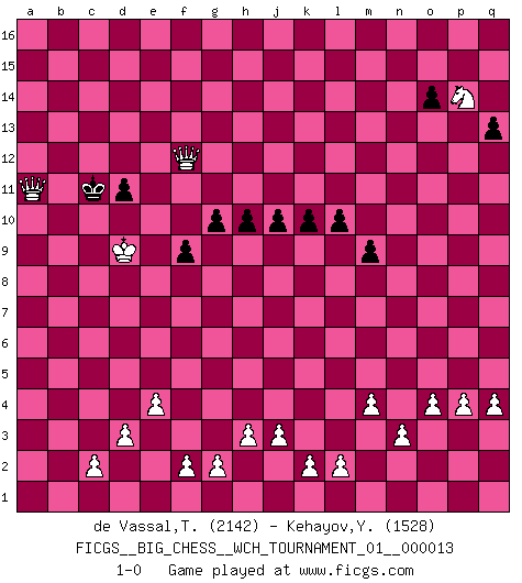 Last move : 1-0 2020 December 2 20:51:19 [Event "FICGS__BIG_CHESS__WCH_TOURNAMENT_01__000013"] [Site "FICGS"] [Date "2020.04.03"] [Round "1"] [White "de Vassal,Thibault"] [Black "Kehayov,Yulian"] [Result "1-0"] [WhiteElo "2142"] [BlackElo "1528"] 1.j2-k4 p16-o14 2.h2-g4 j15-k13 3.h1-o7 h15-g13 4.m2-m4 b16-c14 5.l1-p5 k16-h15 6.p1-o3 m15-m13 7.e2-e4 h16-m12 8.b1-c3 e15-e13 9.f1-b5 g16-j15 10.d2-d3 q15-q14 11.n2-n3 a15-a14 12.o1-j6 n15-n13 13.c1-l9 d15-d13 14.m1-m3 f16-c13 15.m3-l3 o16-g9 16.l9-k10 m12-n12 17.j6-h7 c16-k9 18.h7-k9 n12-k9 19.k10-n13 k9-o13 20.o7-o13 l16-o13 21.l3-l6 l15-l14 22.e1-e3 q16-p16 23.e3-f3 e16-e14 24.a1-e1 m16-n16 25.n13-k10 g9-h8 26.f3-f8 h8-k10 27.p5-k10 o14-p12 28.e1-e3 e14-f14 29.e3-f3 f14-f8 30.f3-f8 a16-e16 31.q1-m1 e16-e14 32.m1-m3 c13-e15 33.q2-q4 e14-f14 34.f8-f14 e15-f14 35.m3-l3 p15-p14 36.l3-l5 g13-h11 37.k10-f14 h15-f14 38.b5-h11 j16-h15 39.l6-b6 n16-b16 40.l5-b5 b15-b13 41.b5-c5 b16-b14 42.b6-c6 c14-e15 43.c6-c15 p16-e16 44.o3-n5 h15-g14 45.c15-c9 d13-d12 46.h11-k9 o13-k9 47.c9-k9 e15-d13 48.p2-p4 a14-a13 49.k9-n9 k13-m14 50.c3-d5 a13-a12 51.k1-l3 g14-h15 52.g1-f3 h15-g14 53.n9-g9 g14-h15 54.g9-c9 h15-g16 55.l3-m5 b14-b15 56.f3-g5 e16-e15 57.g4-h6 b15-c15 58.c9-c15 e15-c15 59.c5-c15 d13-c15 60.h6-j8 g16-h15 61.k4-l6 h14-h13 62.j8-k10 g15-g14 63.l6-m8 j15-k13 64.o2-o4 h15-h14 65.a2-a4 h14-j13 66.j1-j2 j13-k12 67.k10-h11 k12-l13 68.h11-g13 k13-h14 69.g5-f7 l13-k13 70.n5-m7 k13-j13 71.m8-n10 j13-h12 72.g13-f11 h12-g12 73.f11-e13 g12-f13 74.e13-f11 f13-e12 75.f7-e9 f14-g12 76.m7-k8 c15-e14 77.k8-h9 g12-e13 78.f11-d10 e12-d13 79.h9-f10 h14-f13 80.d5-e7 d13-d14 81.e7-f9 m14-l12 82.e9-d11 e13-d11 83.f10-d11 e14-c13 84.d11-c13 d14-c13 85.d10-e12 c13-d13 86.f9-g11 f13-g11 87.e12-g11 d13-e13 88.j2-k3 f15-f13 89.k3-j4 e13-f12 90.g11-f9 b13-b12 91.j4-h5 a12-a11 92.h5-g6 b12-b11 93.f9-d10 b11-b10 94.d10-c12 l12-j13 95.c12-a11 j13-g12 96.a11-c12 b10-b9 97.c12-a11 b9-b8 98.a11-c10 d12-d11 99.c10-b8 l14-l13 100.g6-f7 f12-e11 101.f7-e8 e11-d10 102.e8-d8 g14-g13 103.b2-b4 d10-e11 104.a4-a5 g12-f14 105.b4-b5 g13-g12 106.a5-a6 f13-f12 107.b5-b6 f12-f11 108.a6-a7 f14-d13 109.b6-b7 d13-c11 110.b8-d9 c11-d9 111.d8-d9 q14-q13 112.b7-b8 m13-m12 113.n10-o12 p12-n13 114.b8-b9 f11-f10 115.a7-a8 g12-g11 116.a8-a9 h13-h12 117.b9-b10 j14-j13 118.a9-a10 k15-k14 119.b10-b11 k14-k13 120.m5-l7 j13-j12 121.l7-m9 h12-h11 122.m9-o10 g11-g10 123.o12-m11 n13-m11 124.o10-m11 l13-l12 125.m11-n13 o15-o14 126.n13-p14 m12-m11 127.a10-a11 m11-m10 128.a11-a12 l12-l11 129.a12-a13 k13-k12 130.a13-a14 k12-k11 131.a14-a15 l11-l10 132.a15-a16 m10-m9 133.b11-b12 j12-j11 134.b12-b13 k11-k10 135.b13-b14 h11-h10 136.b14-b15 j11-j10 137.b15-b16 f10-f9 138.b16-g11 e11-d12 139.g11-f12 d12-c11 140.a16-a11 1-0 Follow this game move after move (download)Man is a frivolous, a specious creature, and like a Chess player, cares more for the process of attaining his goal than for the goal itself. (Dostoyevsky) Es ist wirklich schade, dass so viele Schachspieler nicht auf ihr Äußeres achten! (Alexandra Kosteniuk) Cuando tengas duda... ¡juega al Ajedrez!. (Tevis) Il vaut mieux sacrifier les pièces de l'adversaire. (Xavier Tartacover) Statistics can be made to prove anything - even the truth. (Author unknown)