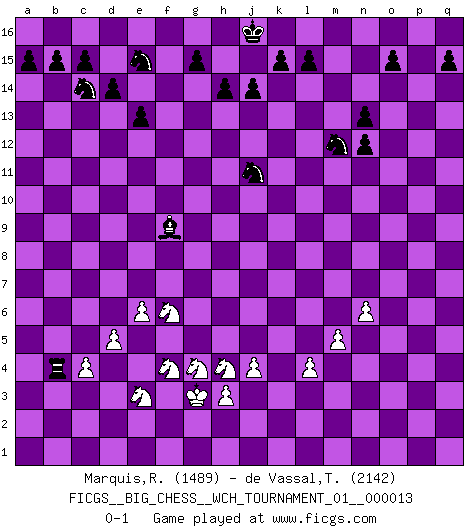 Last move : 0-1 2020 August 2 12:1:36 [Event "FICGS__BIG_CHESS__WCH_TOURNAMENT_01__000013"] [Site "FICGS"] [Date "2020.04.03"] [Round "1"] [White "Marquis,Roland"] [Black "de Vassal,Thibault"] [Result "0-1"] [WhiteElo "1489"] [BlackElo "2142"] 1.m2-m4 j15-k13 2.n2-n4 h16-o10 3.p1-o3 o10-f2 4.h2-f3 f2-n9 5.n4-n5 h15-g13 6.l1-p5 e15-e13 7.j2-k4 b16-c14 8.b1-c3 f16-b12 9.l2-l3 n15-n14 10.h1-o7 d15-d14 11.o1-l4 p16-o14 12.p5-g13 n9-g3 13.k1-h2 g3-g13 14.o7-f15 g13-e15 15.f15-e15 g16-e15 16.d2-d3 c16-h11 17.e2-e4 e16-f16 18.f1-e2 f16-f10 19.c1-j7 f10-b10 20.a1-b1 a16-f16 21.c3-d5 b12-g7 22.e4-e5 f16-f7 23.j7-g5 b10-p10 24.q1-p1 o16-j11 25.l4-k3 f7-f12 26.k4-h5 g7-m12 27.k3-j4 p10-p9 28.g1-j2 m15-m13 29.d5-f6 o14-n12 30.d3-d4 n14-n13 31.q2-q3 m16-m14 32.e2-d3 p15-p13 33.p2-p4 f12-f10 34.h2-g4 f10-q10 35.p1-p3 h11-g10 36.a2-a3 m14-o14 37.d3-n12 m13-n12 38.m4-m5 l16-q11 39.j4-q11 q10-q11 40.c2-c4 p9-o9 41.j2-k4 o9-o3 42.g5-p13 o14-o13 43.p3-o3 o13-o3 44.j1-j2 q11-q3 45.m1-o1 q16-p16 46.p13-j7 p16-p4 47.k4-l2 j11-k10 48.l2-m4 o3-o9 49.l3-l4 k10-h8 50.j7-h8 m12-h8 51.m4-k5 o9-o2 52.o1-o2 h8-o2 53.g4-j5 q3-q2 54.b2-b4 p4-p2 55.e1-k1 o2-p3 56.n5-n6 p3-n5 57.f3-h4 n5-k2 58.k1-k2 p2-k2 59.j2-j1 k2-g2 60.h4-g2 q2-q1 61.j1-h2 q1-b1 62.d4-d5 b1-b3 63.e5-e6 b3-a3 64.j3-j4 a3-a4 65.g2-e3 a4-b4 66.h5-f4 k16-l14 67.h2-g3 k13-j11 68.k5-h4 l14-m12 69.j5-g4 g10-f9 0-1 This big chess game has been lost on time (started : 2020.04.03 19:3:27) Follow this game move after move (download)First-class players lose to second-class players because second-class players sometimes play a first-class game. (Siegbert Tarrasch) Jede Eröffnung ist gut genug um gespielt zu werden, wenn nur ihr Ruf schlecht genug ist. (Savielly Grigorievitsch Tartakower) En el Ajedrez, cuando menos, el valiente hereda la tierra. (Edmar Mednis) Les Echecs ne sont pas pour les âmes timides. Ils requièrent un homme entier, qui ne s'arrête pas aveuglément à ce qui a été déjà établi, mais qui tente individuellement de sonder les profondeurs du jeu. (W. Steinitz) Chess is as much a mystery as women. (Purdy)