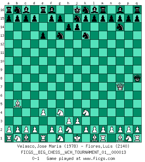 Last move : 0-1 2020 May 15 12:11:25 [Event "FICGS__BIG_CHESS__WCH_TOURNAMENT_01__000013"] [Site "FICGS"] [Date "2020.04.03"] [Round "1"] [White "Velasco,Jose Maria"] [Black "Flores,Luis"] [Result "0-1"] [WhiteElo "1978"] [BlackElo "2140"] 1.j2-k4 h15-g13 2.h2-g4 p16-o14 3.e2-e4 j15-k13 4.f1-b5 h16-q8 5.k1-h2 e15-e13 6.h1-o7 g16-j15 0-1 This big chess game has been lost on time (started : 2020.04.03 19:3:27) Follow this game move after move (download)Those who say they understand Chess, understand nothing. (Robert Hubner) Herr Iljumschinow ist ein etwas merkwürdiger Geschäftsmann: Er arbeitet zusammen mit Leuten wie Muammar al-Gaddafi; früher ist das Saddam Hussein gewesen. (Joel Lautier) El Jaque al descubierto es el bombardero del tablero. (Reuben Fine) Roi des jeux et jeu des rois, les échecs portent en eux un sentiment d'infini. Ils donnent à celui qui s'est efforcé d'en approfondir les arcanes l'impression de n'être pas à la mesure de l'homme; en fait, ils constituent un résumé de l'univers, un microcosme, et figurent cette grande échelle qui, dans les plans de la lumière descend jusqu'à la matière, qui des abîmes insondables remonte jusqu'en l'infini de Dieu. (Pyrame) Convictions are more dangerous enemies of truth than lies. (Friedrich Nietzsche)