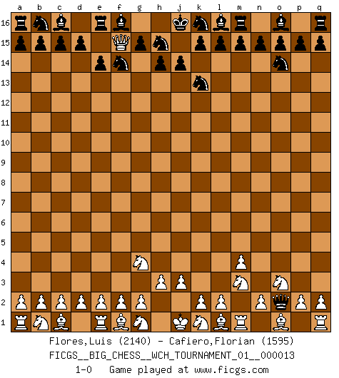 Last move : 1-0 2020 April 12 9:43:53 [Event "FICGS__BIG_CHESS__WCH_TOURNAMENT_01__000013"] [Site "FICGS"] [Date "2020.04.03"] [Round "1"] [White "Flores,Luis"] [Black "Cafiero,Florian"] [Result "1-0"] [WhiteElo "2140"] [BlackElo "1595"] 1.j2-k4 j15-k13 2.h1-o7 g16-f14 3.h2-g4 p16-o14 4.o7-f15 h16-o10 5.m2-m4 o10-o2 6.p1-o3 e15-e14 7.k4-m3 1-0 Follow this game move after move (download)The hardest game to win is a won game. (Emanuel Lasker) Es tut gut, die Entwicklungsperiode von, [...] demokratischem Geist durchdringen zu lassen. Wie undemokratisch wäre es doch beispielsweise, den einen Offizier große Spaziertouren vornehmen zu lassen, während die anderen zu Hause säßen und sich entsetzlich langweilten. (Aaron Nimzowitsch) Me siento como si fuera una pieza en una partida de Ajedrez, cuando mi oponente me indica: esa pieza no puede ser movida. (Soren Kierkegaard) Le moment que je préfère le plus dans une rencontre, c'est celui où je sens que la personnalité de l'adversaire se brise. (Robert Fischer) The only difference between a tax man and a taxidermist is that the taxidermist leaves the skin. (Mark Twain)