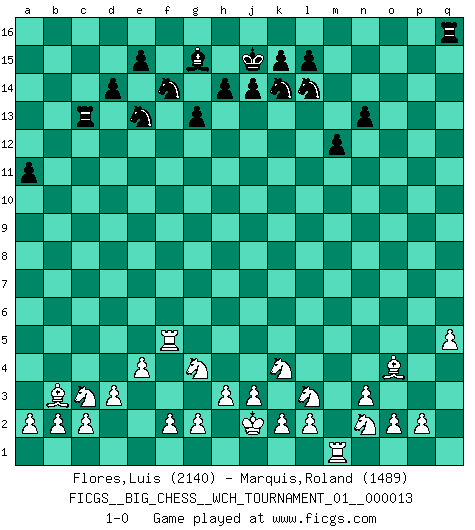 Last move : 1-0 2020 July 24 6:45:5 [Event "FICGS__BIG_CHESS__WCH_TOURNAMENT_01__000013"] [Site "FICGS"] [Date "2020.04.03"] [Round "1"] [White "Flores,Luis"] [Black "Marquis,Roland"] [Result "1-0"] [WhiteElo "2140"] [BlackElo "1489"] 1.j2-k4 g15-g13 2.h1-o7 p16-o14 3.o7-f15 g16-f14 4.f15-o7 f16-g15 5.b1-c3 d15-d14 6.e2-e4 c16-g12 7.f1-c4 n15-n14 8.d2-d3 o16-c5 9.h2-g4 g12-h13 10.o7-m5 c5-g9 11.m5-b15 b16-d15 12.b15-c15 d15-e13 13.c15-c9 g9-c13 14.m2-m4 e16-b16 15.c4-b3 c13-m4 16.m1-m4 m15-m13 17.l1-o4 b16-c16 18.c9-p9 p15-p14 19.c1-p13 k16-m15 20.p9-o9 a15-a13 21.p13-o14 m15-o14 22.o9-o14 l16-m15 23.o14-o15 j15-l14 24.n2-n3 h15-k14 25.o15-o5 q16-o16 26.o5-q3 q15-q13 27.o1-h7 c16-c13 28.p1-n2 h13-g12 29.q3-q10 n14-n13 30.o4-p3 o16-o14 31.q1-m1 m16-o16 32.k1-l3 o14-o10 33.q10-p11 m15-p12 34.g1-j2 a16-c16 35.e1-e3 o10-o12 36.e3-f3 o12-o11 37.p11-j5 o11-o5 38.m4-m5 o5-m5 39.m1-m5 m13-m12 40.h7-p14 o16-o14 41.p14-j8 p12-o13 42.j8-o13 o14-o13 43.j1-h2 a13-a12 44.a1-m1 g12-n6 45.m5-n5 n6-j2 46.h2-j2 q13-q12 47.n5-q5 o13-q13 48.q5-q12 q13-q12 49.j5-q12 j16-j15 50.f3-f5 h16-m16 51.q12-m16 c16-m16 52.q2-q4 a12-a11 53.q4-q5 m16-q16 54.p3-o4 1-0 This big chess game has been lost on time (started : 2020.04.03 19:3:27) Follow this game move after move (download)It is peculiar but a fact nevertheless, that gamblers in chess always have enthusiastic followers. (Botvinnik) Garry Kasparov war erst in der Großmeister-Organisation GMA, dann in der Profischach-Vereinigung PCA, zum Schluss kehrte er wieder in den Schoß der FIDE zurück. Aber gut, manche Leute sind flexibel (Viswanathan Anand) Repentinamente, me resultaba obvio en mi analisis que yo había pasado por alto lo que Fischer había visto en el tablero con la mas grande facilidad. (Mikhail Botvinnik) Les Echecs sont affaire de jugement sensible. Savoir quand frapper et quand esquiver. (Fischer) Panic is a sudden desertion of us, an a going over to the enemy of our imagination. (Christian Nevell Bovee)