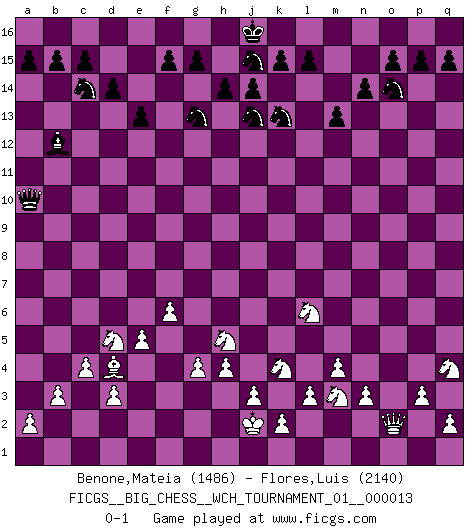 Last move : 0-1 2020 August 11 23:38:33 [Event "FICGS__BIG_CHESS__WCH_TOURNAMENT_01__000013"] [Site "FICGS"] [Date "2020.04.03"] [Round "1"] [White "Benone,Mateia"] [Black "Flores,Luis"] [Result "0-1"] [WhiteElo "1486"] [BlackElo "2140"] 1.j2-k4 p16-o14 2.g2-g4 j15-k13 3.p1-o3 h15-g13 4.m2-m4 m15-m13 5.b1-c3 e15-e13 6.n2-n3 b16-c14 7.e2-e4 h16-o10 8.h1-f3 f16-b12 9.k4-h5 l16-p12 10.q1-p1 n15-n14 11.d2-d3 e16-e14 12.c1-e3 e14-f14 13.f3-g3 b12-j5 14.h3-h4 j5-b12 15.f2-f4 d15-d14 16.k1-l3 c16-l8 17.f1-j4 o16-f8 18.g1-j2 k16-h15 19.l1-m2 m16-m14 20.o1-k5 m14-l14 21.l3-k1 f8-m2 22.k1-m2 g16-j15 23.m2-l4 a16-e16 24.h2-k3 f14-f12 25.j1-h2 e16-e14 26.e3-d4 e14-f14 27.f4-f5 l8-j6 28.j2-k4 j6-k5 29.j4-k5 o10-b10 30.c3-d5 f12-g12 31.m1-f1 q16-m16 32.b2-b3 l14-l10 33.l2-l3 m16-m14 34.e4-e5 m14-l14 35.l4-j5 b10-b11 36.h2-h3 l10-l9 37.f5-f6 l9-p9 38.k3-l5 g12-m12 39.c2-c4 b11-p11 40.p2-p3 m12-o12 41.k5-l6 p12-q11 42.o3-q4 o12-o2 43.p1-p2 o2-p2 44.q4-p2 q11-l6 45.j5-l6 p11-q11 46.p2-q4 p9-o9 47.f1-o1 f14-f9 48.o1-o9 f9-o9 49.e1-o1 l14-l9 50.h3-j2 o9-o1 51.a1-o1 l9-o9 52.g3-j1 q11-o13 53.o1-o9 o13-o9 54.j1-n1 h15-j13 55.l5-m3 o9-o10 56.n1-o2 o10-a10 0-1 Follow this game move after move (download)Chess demands total concentration. (Bobby Fischer) Man braucht nicht immer den besten Zug zu spielen: Ein Zug muß aktiv, unternehmungslustig, korrekt und schön sein. (David Bronstein) El Ajedrez lo es todo: arte, ciencia y deporte. (Anatoly Karpov) Les échecs, c'est la lutte contre l'erreur. (Johannes Zukertort) You cannot beat a roulette table unless you steal money from it. (Albert Einstein)
