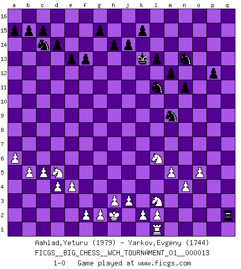 Last move : 1-0 2020 October 27 0:14:57 [Event "FICGS__BIG_CHESS__WCH_TOURNAMENT_01__000013"] [Site "FICGS"] [Date "2020.04.03"] [Round "1"] [White "Aahlad,Yeturu"] [Black "Yarkov,Evgeny"] [Result "1-0"] [WhiteElo "1979"] [BlackElo "1744"] 1.j2-k4 j15-k13 2.h1-o7 h15-g13 3.o7-o15 p16-o14 4.o15-f7 e15-e13 5.m2-m4 h16-o10 6.e2-e4 e16-e14 7.h2-g4 b16-c14 8.p1-o3 f16-b12 9.l1-p5 k16-h15 10.b1-c3 g16-j15 11.f1-b5 e14-f14 12.f7-g6 m15-m13 13.n2-n3 l16-o13 14.g6-o6 o10-l10 15.g4-f6 n15-n14 16.k1-h2 o16-j11 17.o6-p7 f14-f6 18.p5-j11 k13-j11 19.p7-p15 m16-o16 20.h2-g4 f6-p6 21.p15-q14 d15-d14 22.d2-d3 c16-h11 23.b5-h11 g13-h11 24.q14-n11 j15-k13 25.c1-l9 m13-m12 26.n11-m10 l10-m10 27.l9-m10 o14-n12 28.m10-l9 q16-p16 29.q2-q4 n12-l11 30.l9-p5 o13-j8 31.m4-m5 j16-j15 32.o1-f9 h15-g13 33.q1-o1 o16-o9 34.f9-k5 o9-o14 35.o3-n5 p6-p14 36.e1-e3 a16-o16 37.o2-o4 l15-l13 38.p2-p4 b12-g7 39.q4-q5 g7-k10 40.p5-k10 h11-k10 41.m1-m4 j8-k9 42.p4-p5 p14-p5 43.o1-q1 p5-p1 44.q1-p1 p16-p1 45.j1-h2 k9-l10 46.n5-p6 o14-q14 47.k5-n2 l11-n10 48.e3-e1 n10-o8 49.g1-j2 p1-e1 50.a1-e1 o8-p6 51.q5-p6 l10-p6 52.e1-p1 q14-p14 53.n2-h7 p6-l10 54.p1-p14 l10-p14 55.h7-p14 q15-p14 56.c3-d5 o16-o13 57.j2-l3 k13-l11 58.k4-l6 n14-n13 59.g4-j5 n13-n12 60.l6-n7 l11-m9 61.j5-l6 m9-n7 62.l6-n7 n12-n11 63.o4-o5 o13-q13 64.m4-m1 j11-l12 65.a2-a4 j15-k14 66.n3-n4 l12-n13 67.b2-b4 g13-j12 68.c2-c4 j12-l11 69.a4-a5 k10-m9 70.n7-l6 p14-p13 71.b4-b5 p13-p12 72.a5-a6 q13-q2 73.m1-l1 k14-k13 74.d3-d4 f15-f13 75.c4-c5 1-0 This big chess game has been lost on time (started : 2020.04.03 19:3:27) Follow this game move after move (download)If a ruler does not understand Chess, how can he rule over a kingdom ? (King Khusros II) Die unerbitterlichsten Regeln im Schach sind die Ausnahmen. (Savielly Grigorievitsch Tartakower) Si tu oponente no puede hacer nada activo, entonces no apures la posición; En vez de eso, dejalo estar sentado ahí, sufriendo y rogandote por un empate. (Jeremy Silman) Dans le domaine de la peinture, de la gravure et de la sculpture, dès la première décennie de notre siècle, les artistes abandonnent la représentation de la partie d'échecs pour se concentrer sur les pièces, sur les échiquiers et sur toutes les variations auxquelles les unes et les autres peuvent donner lieu. On passe en quelque sorte d'un thème social à un thème musical (au sens de la musica médiévale, c'est-à-dire d'une notion qui inclue le rythme, l'harmonie, la construction et la déconstruction, etc.). Graphiquement et picturalement, l'échiquier apparaît comme une structure ouverte, dynamique, d'une richesse infinie, autorisant toutes les combinatoires et débouchant sur des mouvements et des rythmes de nature exponentielle. (Michel Pastoureau) Somewhere in the world there is an epigram for every dilemma. (Hendrik Willem van Loon)
