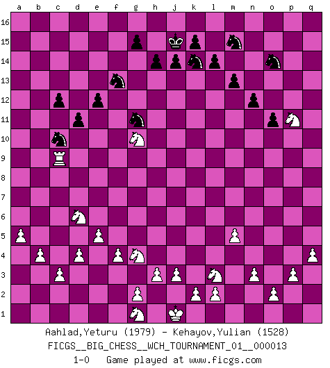 Last move : 1-0 2020 September 24 7:33:58 [Event "FICGS__BIG_CHESS__WCH_TOURNAMENT_01__000013"] [Site "FICGS"] [Date "2020.04.03"] [Round "1"] [White "Aahlad,Yeturu"] [Black "Kehayov,Yulian"] [Result "1-0"] [WhiteElo "1979"] [BlackElo "1528"] 1.j2-k4 p16-o14 2.h1-o7 h15-g13 3.e2-e4 j15-k13 4.b1-c3 m15-m13 5.f1-b5 g16-j15 6.m2-m4 n15-n13 7.d2-d3 b16-c14 8.l1-p5 k16-h15 9.c1-p13 o16-n15 10.n2-n3 e15-e13 11.o1-c12 d15-d14 12.e4-e5 j15-h13 13.e1-e4 c16-e14 14.c12-e14 e16-e14 15.e4-f4 h16-m12 16.a1-e1 q15-q14 17.p13-l9 f16-e15 18.e1-e4 e14-f14 19.f4-f14 e15-f14 20.h2-g4 n15-j11 21.l9-j11 k13-j11 22.o7-e7 j11-k13 23.p1-o3 l16-o13 24.e4-f4 g13-j12 25.e7-j7 f14-p5 26.o3-p5 k13-l11 27.f4-f15 a16-c16 28.j7-b7 b15-b14 29.b7-c7 o13-j8 30.f15-f8 j12-g11 31.f8-j8 c14-d12 32.c7-j7 m12-l12 33.m4-m5 j16-j15 34.m1-m4 m16-m14 35.m4-n4 n13-n12 36.q1-m1 q16-n16 37.b5-n16 o14-n16 38.n4-l4 m14-l14 39.j7-m7 c16-d16 40.l4-l6 l12-k13 41.l6-a6 a15-a13 42.j8-c8 c15-c14 43.c8-b8 d16-b16 44.m7-d15 g11-f13 45.d15-a15 b16-f16 46.a15-b14 k13-k10 47.q2-q4 l11-j10 48.a6-a13 n16-o14 49.b8-a8 j10-g11 50.a13-a16 f16-a16 51.a8-a16 o14-q13 52.b14-d16 k10-d16 53.a16-d16 l14-l11 54.k1-l3 c14-c13 55.f2-f4 o15-o13 56.m1-m4 o13-o12 57.m4-o4 l11-q11 58.p2-p3 q11-p11 59.c3-e4 p11-p10 60.o4-o7 p10-a10 61.a2-a3 a10-b10 62.b2-b3 b10-a10 63.a3-a4 a10-c10 64.c2-c3 c10-b10 65.b3-b4 o12-o11 66.o7-q7 q13-o14 67.d16-o16 b10-d10 68.d3-d4 d10-p10 69.p5-n6 l15-l14 70.q7-p7 p10-p7 71.n6-p7 j15-k14 72.a4-a5 d12-c10 73.p7-o9 k14-j15 74.o9-p11 h13-k14 75.o16-o15 k14-m15 76.o15-p15 c10-e9 77.p15-p14 d14-d13 78.p14-q14 h15-k14 79.q14-q9 e9-c10 80.k4-j6 e13-e12 81.j6-h8 d13-d12 82.q9-c9 d12-d11 83.h8-g10 c13-c12 84.e4-d6 1-0 This big chess game has been lost on time (started : 2020.04.03 19:3:27) Follow this game move after move (download)Chess is the art which expresses the science of logic. (Mikhail Botvinnik) Ich spiele ehrlich und spiele, um zu gewinnen. Wenn ich verliere nehme ich meine Medizin. (Robert James Fischer) Los asuntos humanos son como una partida de Ajedrez: solo aquellos que no lo toman seriamente, pueden ser llamados buenos jugadores. (Hung Tzu Ch'eng) La menace est plus forte que l'exécution. (Aaron Nimzovitch) I don't diet. I just don't eat as much as I'd like to. (Linda Evangelista, supermodel)