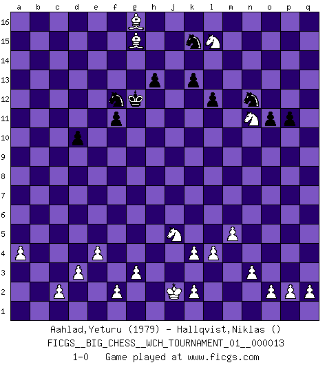 Last move : 1-0 2020 September 11 15:7:57 [Event "FICGS__BIG_CHESS__WCH_TOURNAMENT_01__000013"] [Site "FICGS"] [Date "2020.04.03"] [Round "1"] [White "Aahlad,Yeturu"] [Black "Hallqvist,Niklas"] [Result "1-0"] [WhiteElo "1979"] [BlackElo ""] 1.j2-k4 p16-o14 2.e2-e4 j15-k13 3.h1-o7 g15-g14 4.h2-g4 n15-n14 5.f1-b5 g16-j15 6.b1-c3 b16-c14 7.m2-m4 h16-f14 8.c3-d5 m15-m13 9.p1-o3 e15-e13 10.l1-p5 f14-f10 11.e1-e3 h15-g13 12.e3-f3 f10-b10 13.a2-a4 f16-b12 14.d2-d3 d15-d14 15.c1-o12 c16-l8 16.n2-n3 o16-f8 17.g1-j2 k16-l14 18.m4-m5 n14-n13 19.o12-p13 m16-m14 20.m1-m4 o14-n12 21.p13-q12 p15-p13 22.q12-m8 m14-o14 23.o7-l7 l16-p12 24.k1-h2 f8-d6 25.o1-f9 l8-g4 26.h3-g4 p12-g4 27.f3-f6 d6-e5 28.f6-b6 b10-a9 29.g2-g3 g4-a10 30.b6-a6 a9-b10 31.l7-e7 b10-e7 32.d5-e7 a10-j2 33.j1-j2 e5-b2 34.a1-b1 b2-a3 35.e7-d5 a3-c5 36.h2-g4 l14-m12 37.m4-o4 b12-d10 38.o4-o14 n12-o14 39.a6-o6 c5-n15 40.b5-c4 c14-b12 41.b1-b10 d10-c11 42.b10-o10 j16-h15 43.o10-o14 n15-o14 44.o6-o14 k13-m14 45.o14-o7 o15-o13 46.o7-c7 c11-k4 47.j3-k4 c15-c13 48.d5-f6 e16-e14 49.c4-m13 l15-l13 50.m13-h9 a16-b16 51.q1-b1 q15-q13 52.f9-g10 b15-b13 53.c7-a7 a15-a14 54.b1-b7 b16-b14 55.b7-p7 p13-p12 56.p7-q7 j15-k13 57.a7-f7 f15-f14 58.h9-j10 f14-f13 59.f7-h7 h15-j15 60.h7-h9 m14-n16 61.j10-l12 n16-m14 62.l12-p8 g13-e12 63.h9-q9 m12-o11 64.q9-q13 q16-p16 65.g10-h9 p16-m16 66.q13-q16 b14-b16 67.q16-m16 b16-m16 68.m8-o10 k15-k14 69.l2-l4 m14-n12 70.q7-q15 j15-k16 71.o10-m8 k13-l15 72.p8-n10 o11-p9 73.n10-p8 p9-q11 74.q15-n15 e12-g11 75.h9-g8 n12-o10 76.p8-n6 o10-m11 77.p5-o4 g11-h13 78.o4-j9 n13-n12 79.n15-o15 o13-o12 80.o15-p15 m11-o10 81.p15-p16 m16-p16 82.g8-p16 k14-k13 83.p16-f7 l13-l12 84.o3-n5 n12-n11 85.n5-m7 k16-j15 86.m7-o8 f13-f12 87.n6-e14 l15-m13 88.f6-h7 m13-k12 89.h7-k8 c13-c12 90.g4-j5 j15-k14 91.j9-g7 b12-c14 92.f7-h9 c14-d12 93.e14-c16 h13-g11 94.h9-k7 g11-f9 95.g7-m12 k14-j13 96.m8-e15 d12-f13 97.c16-f13 g14-f13 98.e15-d14 e13-e12 99.k7-l8 f9-g11 100.d14-f12 k12-h13 101.f12-d14 q11-p13 102.m12-j9 f13-f12 103.l8-c16 a14-a13 104.c16-a14 g11-f13 105.d14-c15 f13-d12 106.c15-a13 h13-g11 107.a13-b14 g11-e10 108.j9-k10 o10-m11 109.k10-f14 d12-f11 110.a14-b13 f11-d10 111.b14-a13 e12-e11 112.f14-e13 j13-h13 113.a13-d10 e11-d10 114.b13-c12 f12-f11 115.c12-d13 h13-g12 116.e13-g15 h14-h13 117.d13-g16 m11-l13 118.k8-j10 p13-n12 119.o8-p10 o12-o11 120.p10-n11 p12-p11 121.j10-k12 e10-f12 122.k12-j14 l13-k15 123.j14-l15 1-0 Follow this game move after move (download)To avoid losing a piece, many a person has lost the game. (Savielly Tartakover) Auf Remis zu spielen ist gewissermaßen ein Verbrechen gegen das Schachspiel. (Mikhail Nekhemyevich Tal) Aquel que ve no otra dirección en el juego que la de dar Jaque Mate a su oponente, nunca será un buen jugador de Ajedrez. (Euwe) Horreur, mais aussi harmonie suprême : qu'y avait-il en effet au monde en dehors des échecs ? Le brouillard, l'inconnu, le non-être... (Vladimir Nabokov) Fame, I have already. Now I need the money. (an elderly Steinitz)