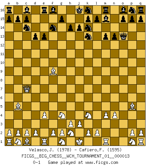 Last move : 0-1 2020 May 27 10:36:40 [Event "FICGS__BIG_CHESS__WCH_TOURNAMENT_01__000013"] [Site "FICGS"] [Date "2020.04.03"] [Round "1"] [White "Velasco,Jose Maria"] [Black "Cafiero,Florian"] [Result "0-1"] [WhiteElo "1978"] [BlackElo "1595"] 1.j2-k4 j15-k13 2.h1-o7 g16-f14 3.o7-f15 h16-o10 4.h2-g4 o10-o2 5.m2-m4 o2-o13 6.f15-c12 b16-c14 7.l1-p5 d15-d14 8.e2-e4 m15-m13 9.k1-h2 d14-d13 10.c12-c7 n15-n13 11.f1-b5 l16-m15 12.n2-n4 e15-e13 13.o1-f9 h15-k14 0-1 This big chess game has been lost on time (started : 2020.04.03 19:3:27) Follow this game move after move (download)I look one move ahead... the best ! (Siegbert Tarrasch) Ich möchte Schüler heranbilden, die das Vermögen haben, selbst zu denken und Kritik zu üben. (Emanuel Lasker) Los problemas de Ajedrez exigen del compositor las mismas virtudes que caracterizan todo el arte de valor: originalidad, invención, concisión, armonía, complejidad e insinceridad explendida. (Vladimir Nabokov) Une platitude souvent récitée à propos des Echecs est qu'une des choses les plus difficiles à réaliser est de gagner une position gagnante. Cela ne manque pas de sens mais, pour ma part, j'ai toujours trouvé plus difficile de gagner une position perdante. (Tim Krabbe) The only sure thing about luck is that it will change. (Wilson Mizner)