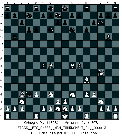 Last move : 1-0 2020 May 30 5:43:22 [Event "FICGS__BIG_CHESS__WCH_TOURNAMENT_01__000013"] [Site "FICGS"] [Date "2020.04.03"] [Round "1"] [White "Kehayov,Yulian"] [Black "Velasco,Jose Maria"] [Result "1-0"] [WhiteElo "1528"] [BlackElo "1978"] 1.j2-k4 h15-g13 2.h1-o7 m15-m13 3.h2-g4 j15-k13 4.p1-o3 d15-d13 5.m2-m4 e15-e13 6.b1-c3 l16-p12 7.k1-h2 c16-l8 8.e2-e4 n15-n14 9.d2-d3 p16-o14 10.l1-o4 f16-b12 11.g1-j2 o16-f8 12.o4-m6 b16-d15 13.n2-n4 h16-m12 14.c1-k8 k16-h15 15.d3-d4 c15-c14 16.f1-c4 m12-d4 17.o1-g8 1-0 This big chess game has been lost on time (started : 2020.04.03 19:3:27) Follow this game move after move (download)What would Chess be without silly mistakes ? (Kurt Richter) Ich spiele 70 Eröffnungssysteme. (Viktor Kortschnoi) Fischer no está bajo la obligación de nadie. (Joseph Platz) Les pièces de l'échiquier étaient impitoyables. Elles le retenaient, elles l'absorbaient. Il y avait de l'horreur en cela, mais aussi une harmonie unique. Car, qu'y a-t-il dans le monde, à part les échecs ? (V. Nabokov) Perhaps the current trend of many chess professionals taking up the more lucrative pastime of poker is not a wholly negative one. It may not be too late for humans to relearn how to take risks in order to innovate and thereby maintain the advanced lifestyles we enjoy. And if it takes a poker-playing supercomputer to remind us that we can't enjoy the rewards without taking the risks, so be it. (The Chess Master and the Computer, by Garry Kasparov - 2010)