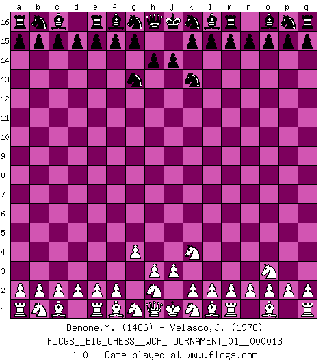 Last move : 1-0 2020 June 6 6:30:50 [Event "FICGS__BIG_CHESS__WCH_TOURNAMENT_01__000013"] [Site "FICGS"] [Date "2020.04.03"] [Round "1"] [White "Benone,Mateia"] [Black "Velasco,Jose Maria"] [Result "1-0"] [WhiteElo "1486"] [BlackElo "1978"] 1.j2-k4 h15-g13 2.g2-g4 j15-k13 3.p1-o3 1-0 This big chess game has been lost on time (started : 2020.04.03 19:3:27) Follow this game move after move (download)I like to say that Bobby Fischer was the greatest player ever. But what made Fischer a genius was his ability to blend an American freshness and pragmatism with Russian ideas about strategy. (Bruce Pandolfini) Vom Schach wurde gesagt das Leben sei dafür nicht lange genug. Aber das ist der Fehler des Lebens, nicht des Schach'. (Irving Chernev) No es una movida, aún la mejor movida que tu debas buscar, sino un plan comprensible. (Eugene Znosko-Borovsky) Le moment que je préfère le plus dans une rencontre, c'est celui où je sens que la personnalité de l'adversaire se brise. (Robert Fischer) Dave, my mind is going. I can feel it. (HAL 9000 in 2001, a space odyssey)