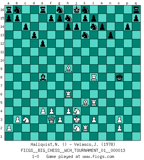 Last move : 1-0 2020 June 14 4:38:56 [Event "FICGS__BIG_CHESS__WCH_TOURNAMENT_01__000013"] [Site "FICGS"] [Date "2020.04.03"] [Round "1"] [White "Hallqvist,Niklas"] [Black "Velasco,Jose Maria"] [Result "1-0"] [WhiteElo ""] [BlackElo "1978"] 1.m2-m4 j15-k13 2.p1-o3 h16-o10 3.j2-h4 o10-c10 4.k2-k3 c10-c2 5.b1-c3 c2-l10 6.j1-k2 e15-e13 7.m1-m3 f16-b12 8.k3-k4 d15-d13 9.m3-l3 l10-k10 10.l1-p5 k10-n10 11.n2-n3 c16-n6 12.g1-j2 n15-n14 13.o1-j6 n10-j10 14.e2-e4 o16-e7 15.g2-g3 e7-h4 16.m4-m5 n6-m5 17.j6-l8 h4-j3 18.k1-j3 j10-f7 19.f2-f4 b12-k4 20.l3-m3 m5-o3 21.p2-o3 f7-p7 22.l2-l3 k4-j3 23.k2-j3 p7-p5 24.q1-p1 p5-k10 25.h2-j4 p15-p14 26.b2-b3 m15-m14 27.c1-b2 k10-k8 28.f1-e2 n14-n13 29.q2-q3 l16-o13 30.h1-f3 e13-e12 31.e1-k1 k8-d8 32.h3-h4 d8-d2 33.b2-a3 d2-d11 34.l8-j6 d11-a11 35.a3-h10 c15-c14 36.e2-c4 a11-h11 37.h10-o4 h11-q3 38.p1-p3 q3-h11 39.c4-o15 p16-n15 40.o15-c4 o13-k9 41.m3-m9 k9-l10 42.m9-h9 h11-m11 43.a1-d1 m16-o16 44.d1-d5 l10-k11 45.h9-h11 o16-o4 46.n3-o4 m11-m6 47.d5-l5 k11-n8 48.j6-k5 n8-j12 49.h11-h6 m6-o4 50.k1-k4 o4-m2 51.k4-k2 m2-m10 52.p3-p10 m10-o8 53.c4-h9 j12-e8 54.p10-l10 n15-l14 55.l10-l8 1-0 Follow this game move after move (download)When I have White, I win because I am white; When I have Black, I win because I am Bogolyubov. (Bogolyubov) Die Auseinandersetzung mit Karpow war politisch geprägt. Er stand für das kommunistische System, wurde von dessen Repräsentanten gehätschelt. Ich war der Oppositionelle. Jeder Schachweltmeister spiegelt auch die gesellschaftlichen Verhältnisse wider. Kramnik steht für die Börsen-Generation des Neuen Markts, ideologiefrei, zahlenfixiert. (Garry Kasparov) Cuando estes solo, cuando te sientas un extraño en el mundo, juega al Ajedrez. Esto levantará tu espiritu y será tu consejero de guerra. (Aristóteles) Les Echecs sont affaire de jugement sensible. Savoir quand frapper et quand esquiver. (Fischer) The production of too many useful things results in too many useless people. (Karl Marx)