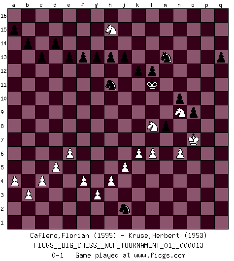 Last move : 0-1 2020 August 30 16:10:35 [Event "FICGS__BIG_CHESS__WCH_TOURNAMENT_01__000013"] [Site "FICGS"] [Date "2020.04.03"] [Round "1"] [White "Cafiero,Florian"] [Black "Kruse,Herbert"] [Result "0-1"] [WhiteElo "1595"] [BlackElo "1953"] 1.j2-k4 h15-g13 2.h2-g4 j15-k13 3.b1-c3 h16-o10 4.p1-o3 e15-e13 5.d2-d3 f16-b12 6.m2-m3 m15-m13 7.l1-p5 k16-h15 8.p2-p3 l16-p12 9.c3-e4 d15-d14 10.g1-f3 c16-l8 11.k1-h2 n15-n14 12.e4-f6 o16-f8 13.p5-m2 l8-k7 14.h2-j4 m16-m14 15.g2-g3 m14-l14 16.c1-h6 f8-h6 17.j4-h6 k7-o3 18.n2-o3 o10-o3 19.o1-q3 o3-o2 20.m2-n1 o2-o3 21.n1-m2 p16-o14 22.h1-m5 o3-m5 23.k4-m5 b16-c14 24.l2-l4 p12-l8 25.q3-l8 l14-l8 26.h3-h4 l8-b8 27.b2-b3 e16-e14 28.q1-o1 e14-f14 29.h6-g8 b12-m2 30.m1-m2 a16-e16 31.m2-n2 f14-f12 32.j1-j2 e16-e14 33.f1-l6 e14-f14 34.e2-e4 f12-c12 35.c2-c4 c12-d12 36.d3-d4 f14-f12 37.o1-o9 f12-o12 38.o9-o12 d12-o12 39.e1-o1 b8-b12 40.d4-d5 q16-m16 41.f3-e5 m16-m14 42.n2-n7 m14-l14 43.l6-h9 l14-l9 44.h9-j10 l9-o9 45.o1-o9 o12-o9 46.a1-n1 b12-n12 47.n7-n12 o14-n12 48.n1-n2 o9-o1 49.e5-d3 c14-d12 50.d3-b4 k13-l11 51.j10-h9 b15-b14 52.k2-k4 g16-f14 53.f2-f4 f14-g12 54.j2-h3 g12-j11 55.h9-j8 h15-j13 56.e4-e5 j16-j15 57.a2-a4 j13-h11 58.b4-c6 h11-g9 59.j8-k7 o1-b1 60.c6-d4 b1-h1 61.h3-g2 h1-d1 62.d4-e2 j11-k9 63.n2-h2 k9-m8 64.k7-h5 g9-j8 65.g4-h6 j8-g7 66.h5-g4 d1-b1 67.e2-d4 b1-b2 68.g2-h3 b2-h2 69.h3-h2 k15-k13 70.d4-e6 g7-e6 71.g4-e6 l15-l13 72.q2-q4 l13-l12 73.h2-h3 j15-k14 74.l4-l5 f15-f13 75.m5-k6 n12-m10 76.h3-j4 m8-l6 77.e6-j2 l6-m4 78.j2-m5 m4-o5 79.m5-k7 o5-p3 80.k7-q13 p15-p14 81.q13-h5 p3-o5 82.q4-q5 o5-p7 83.q5-q6 p7-o5 84.q6-q7 o5-n7 85.h5-k7 g13-h11 86.k7-n4 m10-n8 87.j4-k5 n8-o6 88.k6-j8 o6-n4 89.m3-n4 m13-m12 90.j8-l7 n14-n13 91.l7-n6 o15-o13 92.n6-p5 n13-n12 93.k5-l4 m12-m11 94.l4-m4 k14-l13 95.m4-n5 n12-n11 96.k4-k5 o13-o12 97.n5-n6 n7-m9 98.n4-n5 p14-p13 99.j3-j4 o12-o11 100.p5-o7 o11-o10 101.h6-k7 p13-p12 102.k7-m8 n11-n10 103.o7-q8 m9-n11 104.g8-j7 p12-p11 105.n6-o7 p11-p10 106.j7-l8 p10-p9 107.q8-p6 l11-n12 108.n5-n6 q15-q13 109.q7-q8 p9-q8 110.p6-q8 l13-m12 111.m8-k9 k13-k12 112.f6-g8 d12-f11 113.k9-h10 f11-h10 114.g8-h10 h14-h13 115.e5-e6 m11-m10 116.l5-l6 m10-m9 117.l8-n7 m12-m11 118.o7-p8 h11-k10 119.h10-f11 m9-m8 120.n7-p6 j14-j13 121.f11-g13 g15-g14 122.g13-e14 c15-c13 123.e14-f16 g14-g13 124.f16-h15 k10-h11 125.p6-o8 o10-o9 126.p8-p9 n12-m10 127.o8-p10 m10-n8 128.p9-o8 n11-m13 129.p10-n9 m11-m10 130.q8-p10 n8-l7 131.o8-o7 l7-m5 132.j4-j5 m5-l3 133.k5-k6 l3-j2 134.n9-l8 m10-m11 135.p10-n9 m11-l11 0-1 Follow this game move after move (download)I'm not afraid of Spassky. The world knows I'm the best. You don't need a match to prove it. (Bobby Fischer) Es gibt nur zwei wahre Schachgenies - das andere war Wilhelm Steinitz, der Weltmeister von 1872 bis 1894. (Robert James Fischer) El ganar no lo es todo... pero el perder es nada. (Mednis) Le pion, dans sa simplicité, marche droit devant lui, mais lorsqu'il prend, il le fait obliquement? Ainsi l'homme, tant qu'il reste pauvre, marche dans la droiture et vit honnêtement, mais lorsqu'il recherche les honneurs, il flatte, se parjure et, par les voies obliques, cherche une position supérieure sur l'échiquier du monde. (Jean de Galles) You know what they say : You lie down with the Devil, you wake up in Hell. (Horatio Caine, C.S.I. Miami)