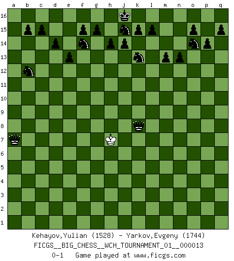 Last move : 0-1 2020 September 19 14:31:17 [Event "FICGS__BIG_CHESS__WCH_TOURNAMENT_01__000013"] [Site "FICGS"] [Date "2020.04.03"] [Round "1"] [White "Kehayov,Yulian"] [Black "Yarkov,Evgeny"] [Result "0-1"] [WhiteElo "1528"] [BlackElo "1744"] 1.j2-k4 p16-o14 2.d2-d3 j15-k13 3.p1-o3 h16-o10 4.h2-g4 n15-n13 5.m2-m4 o16-j11 6.a2-a3 m15-m13 7.h1-m5 l16-p12 8.k1-h2 b16-c14 9.e2-e4 e15-e13 10.n2-n4 f16-b12 11.g1-j2 h15-g13 12.c1-k8 o10-k10 13.l1-o4 k10-b2 14.b1-d2 b2-c2 15.d2-c4 c2-a4 16.m5-a5 a4-g10 17.a5-m5 p12-k7 18.m5-n6 d15-d14 19.f1-e2 c16-n6 20.m4-m5 n6-l8 21.m1-m4 j11-g9 22.m4-m2 b12-c13 23.o4-p3 m16-m14 24.o1-k5 k16-h15 25.a1-b1 c13-b14 26.g4-h6 k7-e2 27.f2-f3 e2-d3 28.c4-e3 d3-b1 29.e1-b1 g9-a3 30.h2-g4 g13-j12 31.j2-h4 a3-h10 32.k8-h10 j12-h10 33.j1-j2 m14-l14 34.p3-h10 g10-h10 35.h4-f5 g16-j15 36.m2-m3 b14-o2 37.q1-o1 o2-b14 38.m3-l3 q16-m16 39.l3-l6 l8-m7 40.l6-p6 m7-k5 41.h6-k5 p15-p14 42.b1-b6 m16-m14 43.o1-n1 e16-e14 44.n1-b1 h10-f10 45.k5-m4 e14-f14 46.g4-h6 a16-e16 47.p6-p7 l14-l12 48.l2-l3 f14-f12 49.b6-b7 f12-b12 50.j2-h2 e16-e14 51.p7-j7 b12-b7 52.b1-b7 e14-f14 53.j7-f7 f10-e10 54.f7-f14 h15-f14 55.p2-p3 l12-b12 56.b7-b12 c14-b12 57.k4-l6 m14-l14 58.j3-j4 a15-a13 59.h2-j3 b14-l5 60.k2-k4 l5-m4 61.o3-m4 e10-m3 62.j3-k3 m3-n4 63.g2-g4 n4-m5 64.k3-j3 l14-l6 65.q2-q4 l6-l3 66.j3-h4 m5-m4 67.k4-k5 l3-p3 68.q4-q5 m4-l3 69.q5-q6 l3-h3 70.h4-j5 h3-f3 71.q6-q7 f3-e4 72.q7-q8 p3-e3 73.q8-q9 e3-h3 74.q9-q10 h3-q3 75.q10-q11 q3-q11 76.j5-h4 q11-g11 77.h4-h5 g11-g4 78.j4-j5 g4-f4 79.k5-k6 f4-f5 80.h6-f5 e4-f5 81.h5-j4 a13-a12 82.j5-j6 a12-a11 83.k6-k7 a11-a10 84.j6-j7 a10-a9 85.k7-k8 a9-a8 86.j7-j8 f5-j8 87.j4-k5 j8-k8 88.k5-j6 a8-a7 89.j6-h5 a7-a6 90.h5-j6 a6-a5 91.j6-h7 a5-a4 92.h7-g7 a4-a3 93.g7-h7 a3-a2 94.h7-j6 a2-a1 95.j6-h7 a1-a7 0-1 This big chess game has been lost on time (started : 2020.04.03 19:3:27) Follow this game move after move (download)The passed Pawn is a criminal, who should be kept under lock and key. Mild measures, such as police surveillance, are not sufficient. (Aaron Nimzovich) Pläne sind die Träume des Verständigen. (Ernst Freiherr von Feuchtersleben) Yo tuve un dolor de muelas en la primer partida. En el segundo juego, tuve un dolor de cabeza. En el tercero, tuve un ataque de reumatísmo. En la cuarta partida, no me sentía muy bien. ¿Y en el quinto juego? Bueno, ¿que acaso uno tiene que ganar todos los juegos?. (Siegbert Tarrasch) Il vaut mieux sacrifier les pièces de l'adversaire. (Xavier Tartacover) It's only after you lost everything, Tyler says, that you're free to do anything. (Chuck Palahniuk, Fight Club)