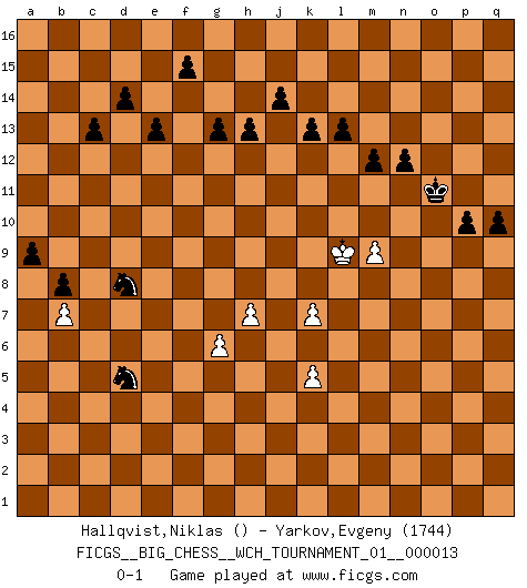 Last move : 0-1 2020 August 30 7:43:37 [Event "FICGS__BIG_CHESS__WCH_TOURNAMENT_01__000013"] [Site "FICGS"] [Date "2020.04.03"] [Round "1"] [White "Hallqvist,Niklas"] [Black "Yarkov,Evgeny"] [Result "0-1"] [WhiteElo ""] [BlackElo "1744"] 1.n2-n4 j15-k13 2.p1-o3 h16-o10 3.g2-g3 m15-m13 4.e2-e4 l16-o13 5.b1-c3 o10-f10 6.h1-f3 f10-o2 7.m2-m4 o2-l2 8.k1-l3 l2-b11 9.h3-h4 h15-g13 10.f1-c4 n15-n14 11.d2-d3 o16-j11 12.l1-o4 d15-d14 13.o1-f9 c16-h11 14.c4-f7 b11-f11 15.f7-e8 h11-f9 16.e8-f9 g16-j15 17.m4-m5 k16-h15 18.c1-g5 b16-c14 19.o3-n5 p16-o14 20.g1-h3 e15-e13 21.h2-j4 o13-h7 22.c3-d5 f11-f9 23.f3-k7 h7-o13 24.e1-e3 f9-b9 25.j1-h2 o13-p12 26.k7-o7 f16-e15 27.g5-p13 j11-k10 28.a1-b1 q15-q14 29.d5-c7 b9-a9 30.p13-f4 a9-a2 31.c7-d5 a2-a11 32.m1-m4 a11-o11 33.q1-o1 o11-o7 34.n5-o7 g13-j12 35.c2-c3 k10-l9 36.b1-a1 l9-f4 37.h3-f4 e15-j11 38.a1-a12 h14-h13 39.o1-a1 j11-g9 40.m4-l4 m16-m14 41.a1-a9 g9-d12 42.a9-b9 d12-b14 43.b2-b4 m14-l14 44.l4-l9 q16-m16 45.b9-f9 l14-l9 46.f9-l9 e16-e14 47.h4-h5 m16-m14 48.g3-g4 m14-l14 49.l9-p9 e14-g14 50.f4-g6 g14-g7 51.o7-m8 l14-l8 52.m8-o9 l8-l9 53.o4-j9 l9-j9 54.e3-f3 h15-g13 55.f3-f8 g7-o7 56.o9-m8 j9-p9 57.m8-o7 p9-p2 58.f8-q8 a16-e16 59.f2-f4 e16-e14 60.q2-q4 e14-f14 61.o7-p5 f14-f11 62.j2-k4 f11-q11 63.q8-q11 p12-q11 64.a12-a10 o14-p12 65.a10-a9 b14-m4 66.k4-h3 q11-n8 67.g6-j5 m4-o2 68.a9-q9 p2-q2 69.q9-q8 n8-k11 70.n4-n5 o15-o13 71.h3-k4 q2-q4 72.q8-k8 k11-l12 73.k8-n8 k13-m12 74.n8-b8 o2-b14 75.h2-h3 l15-l13 76.n5-n6 q14-q13 77.p5-o7 q13-q12 78.b8-q8 q4-q8 79.o7-q8 q12-q11 80.j5-l6 p15-p13 81.l6-n7 m12-o11 82.k4-l6 p12-o10 83.k2-k4 p13-p12 84.j4-l5 p12-p11 85.l3-n4 n14-n13 86.n4-o6 o13-o12 87.h3-j4 k15-k13 88.l5-m7 j15-l14 89.j4-k5 l14-m12 90.l6-m8 o11-m10 91.k5-l6 b14-m4 92.n7-o5 l12-h9 93.m8-k7 m4-j1 94.j3-j4 m10-n8 95.o6-n8 o10-n8 96.q8-o7 m12-n10 97.f4-f5 n10-l9 98.o7-m8 l9-k7 99.m8-k7 g13-h11 100.k4-k5 h11-j9 101.m7-l5 j9-k7 102.l5-k7 n8-l9 103.o5-m6 l9-k7 104.m6-k7 q11-q10 105.j4-j5 j16-k15 106.j5-j6 k15-l14 107.l6-m7 h9-k7 108.j6-k7 m13-m12 109.d5-f6 j1-e5 110.f6-d5 l14-m13 111.c3-c4 m13-n12 112.d5-e3 n12-n11 113.m7-n7 n11-n10 114.e3-g2 c14-d12 115.g2-h4 n10-o9 116.n7-o7 p11-p10 117.h4-k3 j12-k10 118.k3-l5 k10-m9 119.m5-m6 e5-h2 120.l5-n4 o12-o11 121.g4-g5 g15-g13 122.g5-g6 a15-a13 123.n6-n7 m9-k8 124.n7-n8 o9-n9 125.o7-n7 b15-b13 126.n4-p5 a13-a12 127.p5-o7 n9-n10 128.h5-h6 c15-c13 129.b4-b5 b13-b12 130.d3-d4 a12-a11 131.d4-d5 b12-b11 132.o7-m8 n10-o10 133.m8-o7 b11-b10 134.c4-c5 a11-a10 135.c5-c6 a10-a9 136.b5-b6 b10-b9 137.n7-n6 b9-b8 138.b6-b7 d12-e10 139.h6-h7 e10-c9 140.n6-n7 c9-e8 141.n7-m8 e8-d6 142.m8-l8 k8-h9 143.l8-l9 d6-e4 144.l9-m10 n13-n12 145.m6-m7 e4-f6 146.n8-n9 o10-p11 147.m7-m8 f6-d5 148.m8-m9 h9-g7 149.o7-m8 g7-f5 150.n9-n10 f5-e7 151.n10-o11 p11-o11 152.m8-n10 e7-c6 153.n10-l9 h2-f4 154.m10-l10 f4-l9 155.l10-l9 c6-d8 0-1 Follow this game move after move (download)Some sacrifices are sound; the rest are mine. (Mikhail Tal) Woher wissen wir, daß der Neanderthaler Blindschach gespielt hat? -- Bei Ausgrabungen wurden keine Schachbretter und Figuren gefunden. (Anonymous) Botvinnik trataba de restarle el misterio al Ajedrez, siempre relacionandolo a situaciones de la vida ordinaria. El gustaba de llamar al Ajedrez un típico problema inexacto similar a aquellos de los cuales la gente siempre tiene que enfrentarse en la vida cotidiana. (Garry Kasparov) Mon pion favori sur ma case favorite ! Bronstein en parlant d'un coup de pion en h5 quand il avait les Noirs. I find your interest interesting. (Gregory House, House M.D.)