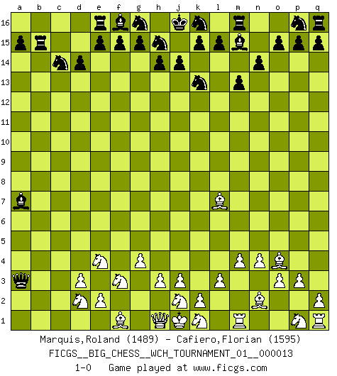 Last move : 1-0 2020 July 20 23:12:10 [Event "FICGS__BIG_CHESS__WCH_TOURNAMENT_01__000013"] [Site "FICGS"] [Date "2020.04.03"] [Round "1"] [White "Marquis,Roland"] [Black "Cafiero,Florian"] [Result "1-0"] [WhiteElo "1489"] [BlackElo "1595"] 1.m2-m4 j15-k13 2.n2-n4 h16-o10 3.o2-o3 o10-f2 4.h2-f3 f2-l7 5.l2-l3 d15-d14 6.d2-d3 c16-l8 7.g2-g4 m15-m13 8.p2-p3 l16-m15 9.l1-o4 l7-o10 10.c1-k8 n15-n14 11.b1-c3 o16-c5 12.k8-l7 o10-b10 13.a2-a3 b10-b2 14.c3-e4 c5-a7 15.a1-b1 b2-c2 16.e1-c1 c2-a2 17.b1-a1 a2-f7 18.o1-n2 l8-j10 19.c1-c15 f7-b11 20.f3-d2 b16-c14 21.a1-b1 b11-j11 22.c15-b15 j11-a3 23.b1-b3 j10-b3 24.d2-b3 a16-b16 25.b3-d2 b16-b15 26.g1-f3 1-0 This big chess game has been lost on time (started : 2020.04.03 19:3:27) Follow this game move after move (download)When you see a good move, look for a better one. (Emanuel Lasker) Der Freibauer hat für mich eine Seele, genau wie der Mensch, Wünsche, die unerkannt in ihm schlummern, und Befürchtungen, von deren Existenz er selbst kaum ahnt. (Aaron Nimzowitsch) Es el objetivo de la escuela moderna no tratar cada posición de acuerdo a una regla general, sino de acuerdo al principio inherente en la posición. (Richard Reti) Avant la finale, les dieux ont créé le milieu de partie. (Tarrasch) For a mechanic, you seem to do an excessive amount of thinking. (C-3PO in Star Wars ep.2)