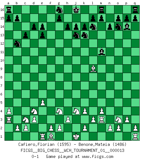 Last move : 0-1 2020 July 21 11:59:48 [Event "FICGS__BIG_CHESS__WCH_TOURNAMENT_01__000013"] [Site "FICGS"] [Date "2020.04.03"] [Round "1"] [White "Cafiero,Florian"] [Black "Benone,Mateia"] [Result "0-1"] [WhiteElo "1595"] [BlackElo "1486"] 1.j2-k4 p16-o14 2.h2-g4 j15-k13 3.p1-o3 b16-c14 4.e2-e4 n15-n14 5.m2-m4 h16-m12 6.g1-f3 d15-d14 7.p2-p3 o16-d6 8.k1-h2 c16-p4 9.b1-c3 e15-e13 10.e4-e5 d6-f8 11.h1-p8 f8-k4 12.j3-k4 p4-k9 13.f3-d4 k9-p14 14.l2-l3 f16-e15 15.h2-j4 k15-k14 16.d2-d3 l16-k15 17.l1-p5 k15-n12 18.a2-a4 n12-m11 19.p8-b8 m12-b12 20.b8-b12 c14-b12 21.c1-l9 e15-l9 22.p5-l9 k16-l14 23.o1-q3 h15-j13 24.m1-m3 e16-e14 25.q3-e14 f15-e14 26.a1-a3 c15-c13 0-1 This big chess game has been lost on time (started : 2020.04.03 19:3:27) Follow this game move after move (download)Suddenly it was obvious to me in my analysis I had missed what Fischer had found with the greatest of ease at the board. (Mikhail Botvinnik) Matt entspricht nicht immer den Tatsachen. (Savielly Grigorievitsch Tartakower) Las piezas de Ajedrez son los bloques del alfabeto que moldean los pensamientos; y esos pensamientos, aunque hagan un diseño visual en el tablero, expresan abstractamente su belleza como un poema. (Marcel Duchamp) Dieu déplace le joueur, et celui-ci la pièce. Quel Dieu derrière Dieu commence donc la trame ? Arturo Perez-Reverte (prix de littérature policière 1993). What doesn't kill us makes us stronger. (Friedrich Nietzsche)