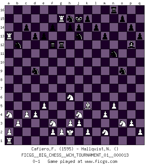 Last move : 0-1 2020 August 3 13:41:42 [Event "FICGS__BIG_CHESS__WCH_TOURNAMENT_01__000013"] [Site "FICGS"] [Date "2020.04.03"] [Round "1"] [White "Cafiero,Florian"] [Black "Hallqvist,Niklas"] [Result "0-1"] [WhiteElo "1595"] [BlackElo ""] 1.j2-k4 p16-o14 2.d2-d3 j15-k13 3.p1-o3 g16-f14 4.h1-l4 m15-m13 5.n2-n3 k16-l14 6.e2-e4 b16-c14 7.f1-e2 e15-e13 8.b1-c3 m16-m14 9.c1-o12 n15-n13 10.o12-f4 d15-d13 11.f4-d6 m14-n14 12.d6-o16 q16-o16 13.m2-m4 f16-b12 14.l1-m2 c16-g12 15.e2-l8 l14-j13 16.l8-g12 f14-g12 17.k4-j2 l16-m15 18.m2-b12 c14-b12 19.l4-b13 a15-a13 20.b13-b15 e16-c16 21.b15-b13 k13-j11 22.b13-l4 n14-l14 23.l4-k3 l14-l8 24.k3-n6 l8-l2 25.n6-n13 h16-l13 26.o1-j6 l2-o2 27.m1-m2 o2-m2 28.k1-m2 h15-k14 29.q1-l1 j11-l12 30.n13-p11 p15-p14 31.j6-g8 o14-n12 32.p11-q10 q15-q13 33.h2-g4 j16-j15 34.j1-h2 c16-n16 35.n3-n4 n12-m10 36.g1-f3 m10-o9 37.q10-o8 l13-g9 38.g8-k5 l12-n11 39.l1-l8 n16-n12 40.e1-l1 l15-l14 41.l8-l9 g9-d6 42.e4-e5 d6-p6 43.p2-p3 m15-q11 44.l1-l6 p6-k11 45.g4-h6 k11-b11 46.b2-b3 b11-c10 47.l6-q6 c10-p10 48.c3-a4 n12-o12 49.o8-f8 f15-f14 50.j2-l3 o16-n16 51.c2-c4 n16-n12 52.n4-n5 q11-p12 53.d3-d4 p10-p7 54.q6-q4 p7-j7 55.l9-c9 c15-c14 56.l3-j4 j7-a7 57.c9-e9 g12-e11 58.e9-e7 a7-a11 59.q4-q7 n12-f12 60.f8-c8 a16-n16 61.e7-a7 a11-b11 62.q7-b7 b11-g6 63.b7-g7 g6-d9 64.c8-d9 e11-d9 65.g7-g15 k14-h15 66.a7-a13 o12-g12 0-1 Follow this game move after move (download)It's just you and your opponent at the board and you're trying to prove something. (Bobby Fischer) Wer sich die Fähigkeit anerziehen will im Schach selbstständig zu denken, der muß alles meiden, was leblos ist: ausgeklügelte Theorien, die sich auf sehr wenige Beispiele und eine Menge Hirngespinste stützen. (Emanuel Lasker) Cuando no sepas que mover, espera por una idea que se le venga a la la cabeza de tu oponente. Tenlo por seguro de que esa idea estará incorrecta. (Siegbert Tarrasch) Des idées, des idées, j'en ai cent, j'en ai mille. Des bonnes, des mauvaises, applicables, irréalisables... Il suffit de faire le tri ! (Roos) Plans are ideas that never come to fruition. (Daniel Parmet)