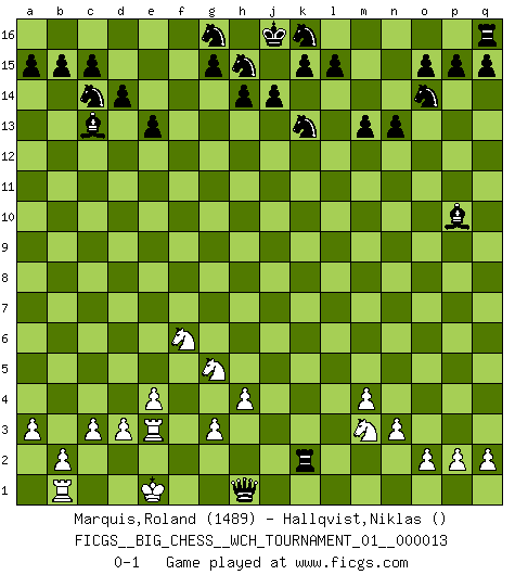 Last move : 0-1 2020 July 6 13:40:36 [Event "FICGS__BIG_CHESS__WCH_TOURNAMENT_01__000013"] [Site "FICGS"] [Date "2020.04.03"] [Round "1"] [White "Marquis,Roland"] [Black "Hallqvist,Niklas"] [Result "0-1"] [WhiteElo "1489"] [BlackElo ""] 1.m2-m4 j15-k13 2.p1-o3 p16-o14 3.b1-c3 b16-c14 4.l1-o4 e15-e13 5.n2-n3 m15-m13 6.f2-f3 h16-o10 7.g2-g3 e16-e14 8.e2-e4 f16-c13 9.d2-d3 n15-n13 10.c1-k8 d15-d14 11.o1-l4 o16-g9 12.k8-l7 o10-l10 13.j2-k4 e14-g14 14.l4-o7 l10-g10 15.o7-g14 f15-g14 16.h3-h4 c16-l8 17.h1-p8 l8-p12 18.f1-l6 g10-c10 19.l6-j4 c10-b10 20.a1-b1 l16-o13 21.k1-m2 a16-f16 22.c3-d5 f16-f8 23.p8-k3 m16-m14 24.l7-h10 g9-h10 25.o4-h10 b10-h10 26.j4-c10 o13-l10 27.c10-g14 l10-g14 28.h2-j4 g14-c10 29.m2-l4 m14-l14 30.g1-h3 c10-j4 31.k3-j4 p12-f3 32.j1-j2 l14-l4 33.o3-n5 l4-l8 34.h3-g5 h10-a10 35.j2-h2 f3-k7 36.a2-a3 f8-f2 37.h2-g1 f2-k2 38.c2-c3 l8-j8 39.j4-f1 j8-j3 40.e1-e3 k2-k4 41.n5-m3 k4-l4 42.m1-j1 j3-j2 43.f1-h3 k7-g4 44.h3-k5 l4-l2 45.j1-j2 l2-j2 46.d5-f6 g4-o11 47.q1-k1 o11-p10 48.k5-k3 j2-g2 49.g1-f1 g2-k2 50.f1-e1 a10-k1 51.k3-h1 k1-h1 0-1 Follow this game move after move (download)In order to improve your game, you must study the endgame before everything else, for whereas the endings can be studied and mastered by themselves, the middle game and the opening must be studied in relation to the endgame. (Jose Raul Capablanca) Wenn es im Universum noch irgendwo intelligente Lebewesen gibt, dann kennen sie Go. (Emanuel Lasker) Las leyes del Ajedrez no permiten una libre elección: tienes que mover quieras o no. (Emanuel Lasker) Mais l'homme est une créature légère et illogique : semblable au joueur d'échecs, il n'aime que le processus du but à atteindre, non le but lui-même. (Dostoïevsky) Never risk one's whole fortune unless supported by one's entire army. (Niccolo Machiavelli)