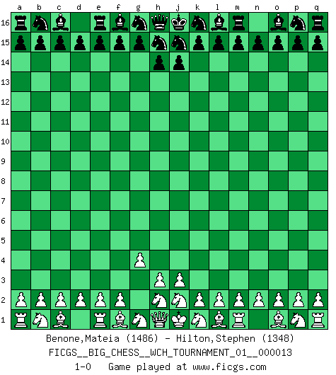Last move : 1-0 2020 April 4 0:49:21 [Event "FICGS__BIG_CHESS__WCH_TOURNAMENT_01__000013"] [Site "FICGS"] [Date "2020.04.03"] [Round "1"] [White "Benone,Mateia"] [Black "Hilton,Stephen"] [Result "1-0"] [WhiteElo "1486"] [BlackElo "1348"] 1.g2-g4 1-0 Follow this game move after move (download)The older I grow, the more I value pawns. (Paul Keres) Bobby Fischer ist kein Vorbild für die heutige Jugend. (Viktor Kortschnoi) Fischer es una tragedia del Ajedrez Americano a la par con Morphy y Pillsbury. (Mig Greengard) Un millionnaire : 'Monsieur Steinitz ! Vous ne participez aux tournois que pour l'argent, alors que moi je n'y viens que pour l'honneur.' Steinitz : 'Chacun joue pour ce qu'il n'a pas'... There are two kinds of tragedy in this world, one is not getting what you want and the other is getting. (Lord of war)