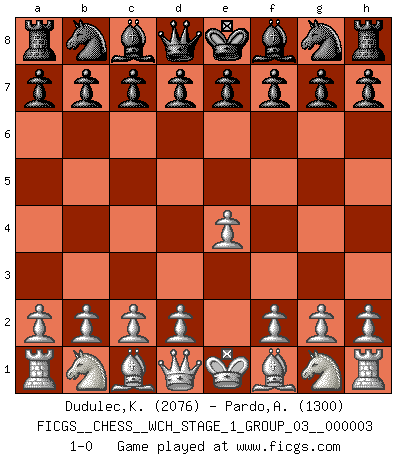 Last move : 1-0 2007 August 14 15:33:38 [Event "FICGS__CHESS__WCH_STAGE_1_GROUP_03__000003"] [Site "FICGS"] [Date "2007.07.11"] [Round "1"] [White "Dudulec,Konstantin"] [Black "Pardo,Alejandro"] [Result "1-0"] [WhiteElo "2076"] [BlackElo "1300"] 1.e4 1-0 This chess game has been lost on time (started : 2007.07.11 16:52:5) King's pawn Opening Player White won this chess game. Follow this game move after move (download)Chess is life. (Bobby Fischer) Glücklicherweise sind Großmeister Ruben Fines reine Schachbücher weniger phallozentrisch [als seine Schachpsychologie] und deswegen auch weniger lächerlich. (Nigel Short) El Ajedrez tiene tanto misterio como las mujeres. (Purdy) La victoire dans une partie d'Echecs appartient la plupart du temps à celui qui voit un peu plus loin que l'adversaire. (Lasker) Go and wake up your luck. (Persian saying)