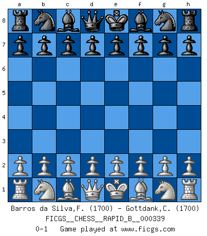 Last move : 0-1 2020 May 9 0:1:14 [Event "FICGS__CHESS__RAPID_B__000339"] [Site "FICGS"] [Date "2020.04.08"] [Round "1"] [White "Barros da Silva,Felipe"] [Black "Gottdank,Carlos"] [Result "0-1"] [WhiteElo "1700"] [BlackElo "1700"] 0-1 This chess game has been lost on time (started : 2020.04.08 12:4:29) Player Black won this chess game. Follow this game move after move (download)Of all my Russian books, the defense contains and diffuses the greatest 'warmth' which may seem odd seeing how supremely abstract Chess is supposed to be. (Vladimir Nabokov) Schach sollte überall auf der Welt Schulfach werden. Es fördert die geistige Auseinandersetzung. Es lehrt die Demut in der Niederlage. (Garry Kasparov) Todos los jugadores de Ajedrez deberían tener un pasatiempo. (Savielly Tartakower) Plusieurs personnes se sont demandées comment Tal faisait pour gagner... En fait, c'est très simple ! Il met ses pièces au centre de l'échiquier et les sacrifie quelque part ! (David Bronstein) The existence of forgetting has never been proved: We only know that some things don't come to mind when we want them. (Friedrich Nietzsche)