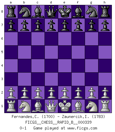 Last move : 0-1 2020 May 9 0:1:14 [Event "FICGS__CHESS__RAPID_B__000339"] [Site "FICGS"] [Date "2020.04.08"] [Round "1"] [White "Fernandes,Clesio"] [Black "Zaunercik,Ilmar"] [Result "0-1"] [WhiteElo "1700"] [BlackElo "1783"] 0-1 This chess game has been lost on time (started : 2020.04.08 12:4:29) Player Black won this chess game. Follow this game move after move (download)Chess is a terrific way for kids to build self image and self esteem. (Saudin Robovic) Pläne sind die Träume des Verständigen. (Ernst Freiherr von Feuchtersleben) El estómago es una parte esencial del maestro de Ajedrez. (Bent Larsen) Les échecs c'est le défi de l'alpiniste, toujours plus haut, prêt à tout pour monter à l'assaut du Roi ennemi. Les échecs, c'est de la musique en mouvement, un ballet majestueux pour les yeux. C'est de la poésie composée par les fantômes du passé qui au même titre que Rimbaud ou Verlaine méritent notre admiration. Les échecs, c'est de la peinture ou le moindre mouvement modifie le tableau pour en faire un Picasso ou un Van Gogh. Les échecs, c'est tout et rien, c'est la vie et la mort. Jjulie33 sur le forum de France-Echecs. I have opinions of my own - strong opinions - but I don't always agree with them. (George Bush)