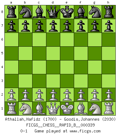 Last move : 0-1 2020 May 9 0:1:14 [Event "FICGS__CHESS__RAPID_B__000339"] [Site "FICGS"] [Date "2020.04.08"] [Round "1"] [White "Athallah,Hafidz"] [Black "Goodis,Johannes"] [Result "0-1"] [WhiteElo "1700"] [BlackElo "2030"] 0-1 This chess game has been lost on time (started : 2020.04.08 12:4:29) Player Black won this chess game. Follow this game move after move (download)The hallmark of the artist is simplicity. (Larry Evans) Dieses schreckliche Gefühl, dass ich gegen eine Maschine spielte, die niemals Fehler macht, zerschmetterte meinen Widerstand. (Mark Taimanov) El jugador blanco perdió porque fallo en recordar la coreccta continuación y tuvo que pensar por sí mismo las movidas. (Siegbert Tarrasch) La vérité est comme le meilleur coup aux échecs : elle existe, mais il faut la chercher. (Arturo Perez-Reverte) Perhaps chess is the wrong game for the times (The Chess Master and the Computer, by Garry Kasparov - 2010)