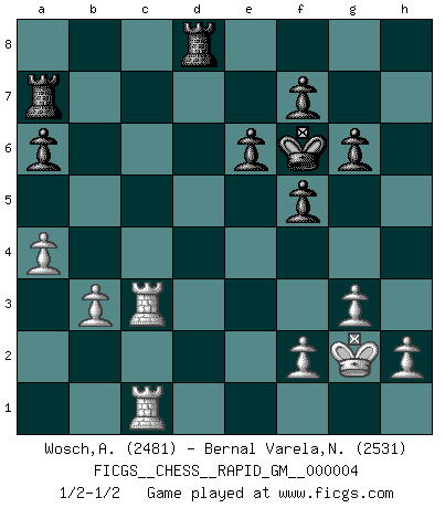 Last move : 1/2-1/2 2020 June 12 1:2:47 [Event "FICGS__CHESS__RAPID_GM__000004"] [Site "FICGS"] [Date "2020.04.08"] [Round "1"] [White "Wosch,Arkadiusz"] [Black "Bernal Varela,Nelson"] [Result "1/2-1/2"] [WhiteElo "2481"] [BlackElo "2531"] 1.e4 e6 2.d4 d5 3.Nc3 Nf6 4.Bg5 dxe4 5.Nxe4 Be7 6.Bxf6 gxf6 7.Nf3 f5 8.Nc3 a6 9.g3 b5 10.Bg2 Bb7 11.O-O c5 12.dxc5 Qxd1 13.Rfxd1 Bxc5 14.Ne2 Ke7 15.a4 b4 16.Rac1 Ra7 17.c3 Kf6 18.Ne1 bxc3 19.Rxc3 Bxg2 20.Kxg2 Bb4 21.Rc4 Bxe1 22.Rxe1 Nd7 23.b3 Ne5 24.Rc3 Rd8 25.Nf4 Ng6 26.Nxg6 hxg6 27.Rec1 1/2-1/2 French : Burn variation Kingside Castling by player White (move 11) This chess game ended in a draw. Follow this game move after move (download)All that matters on the Chessboard is good moves. (Bobby Fischer) Viele Opfer benötigen überhaupt keine konkrete Berechnung. Es genügt sich die entstehende Position kurz vorzustellen, um uns davon zu überzeugen, dass das Opfer korrekt ist. (Mikhail Nekhemyevich Tal) Juega la Apertura como un libro, el Juego Medio como un mago y los Finales como una máquina. (Spielmann) Demandez au pauvre Cg1 ce qu'il en pense. Eduard Gufeld à propos de la variante Saemisch de l'Est-Indienne. Shallow men believe in luck. Strong men belive in cause and effect. (Ralph Waldo Emerson)