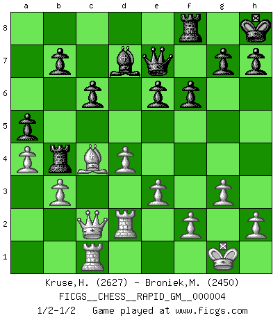 Last move : 1/2-1/2 2020 April 29 8:17:49 [Event "FICGS__CHESS__RAPID_GM__000004"] [Site "FICGS"] [Date "2020.04.08"] [Round "1"] [White "Kruse,Herbert"] [Black "Broniek,Mariusz Maciej"] [Result "1/2-1/2"] [WhiteElo "2627"] [BlackElo "2450"] 1.d4 Nf6 2.c4 e6 3.g3 d5 4.Nf3 dxc4 5.Bg2 Bb4+ 6.Bd2 a5 7.Qc2 Bxd2+ 8.Qxd2 c6 9.a4 Ne4 10.Qc2 Nd6 11.O-O Na6 12.Qc3 Nb4 13.Ne5 Nd5 14.Qc1 O-O 15.Na3 Nb6 16.Rd1 Ra6 17.e3 Qe7 18.Bf1 f6 19.Nexc4 Nbxc4 20.Nxc4 Nxc4 21.Bxc4 Rb6 22.b3 Kh8 23.Qc2 Bd7 24.Rac1 Rb4 25.Rd2 1/2-1/2 Catalan Opening Kingside Castling by player White (move 11) Kingside Castling by player Black (move 14) This chess game ended in a draw. Follow this game move after move (download)You need not play well - just help your opponent to play badly. (Genrikh Chepukaitis) Die FIDE ist dabei in die Hände der russischen Mafia zu fallen. (Larry Evans) No existe un remordimiento como el remordimiento del Ajedrez. (H. G. Wells) Les sacrifices démontrent seulement que quelqu'un a gaffé. (Savielly Tartacover) Bobby never cared about money, though. His only desire was to prove that his choices were correct: He wanted chess to be important because he was a chess player, and he wanted to be important. Bobby knew money was important, but he didn't have a clue why, outside of clothes and status. The only way he could accomplish what he wanted was to fight for a lot of money. Once he got it, he gave it away. He did not know how to spend it. And once he'd become champion, after, essentially, sacrificing his life for it, he didn't know how to spend his time. (Bob Wade)