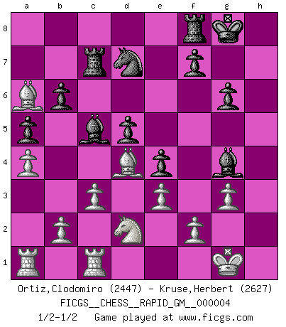 Last move : 1/2-1/2 2020 April 29 23:31:17 [Event "FICGS__CHESS__RAPID_GM__000004"] [Site "FICGS"] [Date "2020.04.08"] [Round "1"] [White "Ortiz,Clodomiro"] [Black "Kruse,Herbert"] [Result "1/2-1/2"] [WhiteElo "2447"] [BlackElo "2627"] 1.Nf3 Nf6 2.g3 c5 3.Bg2 Nc6 4.d4 cxd4 5.Nxd4 e5 6.Nb3 d5 7.Bg5 Be6 8.O-O e4 9.Nd4 Nxd4 10.Qxd4 Be7 11.Qa4+ Qd7 12.Qxd7+ Nxd7 13.Be3 Rc8 14.c3 h5 15.Bd4 O-O 16.Nd2 a5 17.a4 h4 18.Rfb1 hxg3 19.hxg3 b6 20.Rc1 g6 21.e3 Bc5 22.Bf1 Bg4 23.Ba6 Rc7 1/2-1/2 Reti Opening Kingside Castling by player White (move 8) Kingside Castling by player Black (move 15) This chess game ended in a draw. Follow this game move after move (download)The winner of the game is the player who makes the next-to-last mistake. (Savielly Tartakover) Mit Schach schule ich mein Gefühl für Geometrie, was für Tennis und Schach gleichermaßen wichtig ist. (Boris Becker) Los libros de Ajedrez deben de usarse igual como usamos los anteojos: para mejorar la vista, aunque algunos jugadores los quieren usar como si ellos les otorgaran la vision. (José Raúl Capablanca) Vous savez, camarade Pachman, je n'éprouve pas de plaisir à être ministre, je jouerais plutôt aux échecs comme vous, ou alors ferais une révolution au Venezuela. (Che Guevara à Ludek Pachman, 'Checkmate in Prague', 1975) Ah, the Socrating method. The best way we have of teaching everything-apart from juggling chainsaws. (Gregory House, House M.D.)