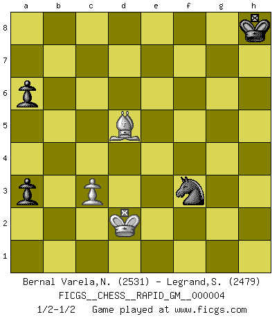Last move : 1/2-1/2 2020 August 13 12:47:16 [Event "FICGS__CHESS__RAPID_GM__000004"] [Site "FICGS"] [Date "2020.04.08"] [Round "1"] [White "Bernal Varela,Nelson"] [Black "Legrand,Stephane"] [Result "1/2-1/2"] [WhiteElo "2531"] [BlackElo "2479"] 1.d4 Nf6 2.c4 e6 3.g3 d5 4.Nf3 Be7 5.Bg2 O-O 6.O-O dxc4 7.Qc2 a6 8.a4 Bd7 9.Qxc4 Bc6 10.Bf4 Bd6 11.Rd1 Bxf4 12.gxf4 Bd5 13.Qd3 Nc6 14.a5 Nb4 15.Qd2 Qe7 16.Nc3 Ne4 17.Qc1 f6 18.Nxd5 Nxd5 19.Qc2 Nd6 20.e3 c6 21.Kh1 Kh8 22.Rg1 Rae8 23.Bf1 Nf7 24.Rg3 e5 25.fxe5 fxe5 26.dxe5 Nxe5 27.Ng5 Nf6 28.Bh3 h6 29.Ne6 Rf7 30.Rd1 Nh5 31.Rg2 Qf6 32.Nd4 g5 33.Bf5 Ng7 34.Be4 Rd8 35.f3 Ne6 36.R2g1 Nxd4 37.exd4 Nd7 38.Qc3 Re8 39.Rg2 Rg7 40.Qb4 Rge7 41.d5 cxd5 42.Bxd5 b6 43.h4 bxa5 44.Qd2 Re5 45.Qc3 Re2 46.hxg5 hxg5 47.Rxg5 Re1+ 48.Rxe1 Rxe1+ 49.Kg2 Qxc3 50.bxc3 Re5 51.Rxe5 Nxe5 52.Kf2 a4 53.Ke3 a3 54.Kd2 Nxf3+ 1/2-1/2 Catalan Opening Kingside Castling by player Black (move 5) Kingside Castling by player White (move 6) 10 pieces endgame at move 50 : White KRBPP , Black KRNPP WHITE : King + 1 Rook 1 Bishop 2 Pawns BLACK : King + 1 Rook 1 Knight 2 Pawns 9 pieces endgame at move 51 : White KRBPP , Black KNPP WHITE : King + 1 Rook 1 Bishop 2 Pawns BLACK : King + 1 Knight 2 Pawns 8 pieces endgame at move 51 : White KBPP , Black KNPP WHITE : King + 1 Bishop 2 Pawns BLACK : King + 1 Knight 2 Pawns 7 pieces endgame at move 54 : White KBP , Black KNPP WHITE : King + 1 Bishop 1 Pawn BLACK : King + 1 Knight 2 Pawns This chess game ended in a draw. Follow this game move after move (download)The game of Chess is not merely an idle amusement; several very valuable qualities of the mind are to be acquired and strengthened by it, so as to become habits ready on all occasions; for life is a kind of Chess. (Benjamin Franklin) Im Fernschach kannst du während dem Spiel rauchen. (John Christen Knudsen) El arma más poderosa en el Ajedrez, es tener la próxima movida. (David Bronstein) Il n'y a plus de joueurs du niveau de Jacob Murray dont la seule quête est le beau jeu, le plaisir de voir les pièces construire quelque chose. Sur 10 idées à la minute, 9 seront sans intérêt, la dernière s'avèrera géniale. (Christian Bauer) It is not true that people stop pursuing dreams because they grow old, they grow old because they stop pursuing dreams. (Gabriel Garcia Marquez)