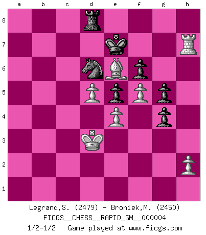 Last move : 1/2-1/2 2020 September 4 17:49:28 [Event "FICGS__CHESS__RAPID_GM__000004"] [Site "FICGS"] [Date "2020.04.08"] [Round "1"] [White "Legrand,Stephane"] [Black "Broniek,Mariusz Maciej"] [Result "1/2-1/2"] [WhiteElo "2479"] [BlackElo "2450"] 1.d4 Nf6 2.c4 e6 3.g3 d5 4.Nf3 dxc4 5.Bg2 Bb4+ 6.Bd2 a5 7.Qc2 Bxd2+ 8.Qxd2 c6 9.a4 Ne4 10.Qc2 Nd6 11.O-O Na6 12.Qc3 Nb4 13.Ne5 Nd5 14.Qc1 O-O 15.Na3 b6 16.Naxc4 Nxc4 17.Nxc4 Nb4 18.Rd1 Ba6 19.b3 Qc7 20.Qb2 Rfd8 21.Rac1 Rac8 22.e4 Bxc4 23.bxc4 e5 24.Bh3 Rb8 25.d5 Na6 26.f4 f6 27.Be6+ Kh8 28.f5 Nc5 29.Qc2 Qe7 30.Kg2 Qe8 31.Ra1 g5 32.g4 cxd5 33.cxd5 Qf8 34.Rac1 Rb7 35.Qe2 Qe8 36.Rc4 Rc7 37.Rdc1 Qe7 38.Qb2 Qd6 39.Qa3 Qf8 40.Qc3 Rd6 41.Qb2 Nd3 42.Rxc7 Nxb2 43.Rf7 Qxf7 44.Bxf7 Rd8 45.Rc6 Nxa4 46.Kf3 Nc5 47.Rxb6 a4 48.Be6 h5 49.Rc6 Nb3 50.Ra6 Nd2+ 51.Ke3 Nc4+ 52.Kd3 Nd6 53.Rxa4 hxg4 54.Ra7 Rb8 55.Ra6 Rd8 56.Rc6 Kg7 57.Rc7+ Kf8 58.Rh7 Ke8 59.Rh8+ Ke7 60.Rh7+ Ke8 61.Rh8+ Ke7 62.Rh7+ 1/2-1/2 Catalan Opening Kingside Castling by player White (move 11) Kingside Castling by player Black (move 14) This chess game ended in a draw. Follow this game move after move (download)I thought the most common mistake [in chess] was the first one: Learning the game :P (Garvin Gray, FICGS forum) Ich habe die Schachforschung dermaßen betrieben, dass sie auf eine wissenschaftliche Basis gestellt wurde. (Mikhail Moiseyevich Botvinik) Desconfianza es la característica mas necesaria de un jugador de Ajedrez. (Siegbert Tarrasch) J'ai vu le vaincu d'Echecs jouer des années durant dans l'espoir de la fête de la victoire. Car tu es plus riche de ce qu'elle existe si même elle n'est point pour toi. Ainsi de la perle du fond des mers. (Antoine de Saint-Exupéry) When it is a question of money, everybody is of the same religion. (Voltaire)