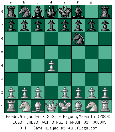 Last move : 0-1 2007 August 12 21:24:22 [Event "FICGS__CHESS__WCH_STAGE_1_GROUP_03__000003"] [Site "FICGS"] [Date "2007.07.11"] [Round "1"] [White "Pardo,Alejandro"] [Black "Pagano,Marcelo"] [Result "0-1"] [WhiteElo "1300"] [BlackElo "2003"] 1.d4 Nf6 0-1 This chess game has been lost on time (started : 2007.07.11 16:52:5) Queen's pawn game Player Black won this chess game. Follow this game move after move (download)The stomach is an essential part of the Chess master. (Bent Larsen) Der 70jährige Viktor Kortschnoi: Die Rentenanstalt wollte mich zwingen in Rente zu gehen. Meine Frau erhält jetzt eine Pension- und ich zahle weiter in die Rentenkasse ein! (Viktor Kortschnoi) Tu sabes que vas a perder. Aún cuando tenía la ventaja, yo sabía que iba a perder. - al estar jugando con Fischer (Andrew Soltis) Les écrivains ont utilisé les échecs pour analyser les côtés extrêmes de la nature humaine. Dans ce cadre, les échecs offrent un champ d'expérimentation idéal. Mais on pourrait faire la même chose avec la peinture. Et là, en vous référant à Van Gogh, vous ne tirerez pas de conclusion définitive sur les peintres. (Gary Kasparov) Horse racing is animated roulette. (Roger Kahn)