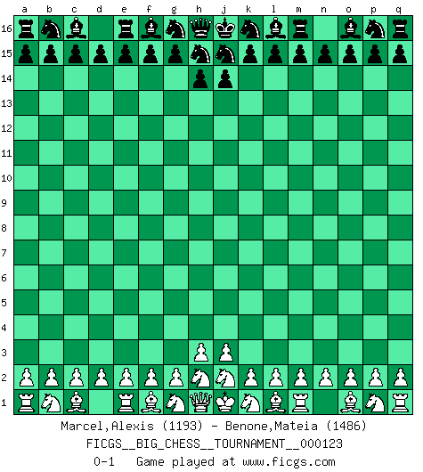 Last move : 0-1 2020 May 11 5:12:47 [Event "FICGS__BIG_CHESS__TOURNAMENT__000123"] [Site "FICGS"] [Date "2020.04.10"] [Round "1"] [White "Marcel,Alexis"] [Black "Benone,Mateia"] [Result "0-1"] [WhiteElo "1193"] [BlackElo "1486"] 0-1 This big chess game has been lost on time (started : 2020.04.10 21:4:41) Follow this game move after move (download)Chess demands total concentration. (Bobby Fischer) Im Schach gewinnt jeder. Hat man Freunde am Spiel - und das ist die Hauptsache - ist auch der Verlust einer Partie kein Unglück. (David Bronstein) Yo adoro todas la posiciones. Denme una partida posicional difícil, y la jugaré. Pero posiciones totalmente ganadas, no las tolero. (Hein Donner) La guerre est enfant de la passion, la passion est enfant du narcissisme et le narcissisme est l'enfant. (...) Une autre partie ? (Thibault de Vassal) There's no money in correspondence chess. (John Knudsen)