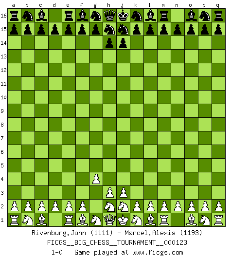 Last move : 1-0 2020 May 11 5:12:47 [Event "FICGS__BIG_CHESS__TOURNAMENT__000123"] [Site "FICGS"] [Date "2020.04.10"] [Round "1"] [White "Rivenburg,John"] [Black "Marcel,Alexis"] [Result "1-0"] [WhiteElo "1111"] [BlackElo "1193"] 1.g2-g4 1-0 This big chess game has been lost on time (started : 2020.04.10 21:4:41) Follow this game move after move (download)Chess problems demand from the composer the same virtues that characterize all worthwhile art: originality, invention, conciseness, harmony, complexity, and splendid insincerity. (Vladimir Nabokov) Der Partner hat auch seine Existenzberechtigung. (Savielly Grigorievitsch Tartakower) El Ajedrez expande y enriquece tu mente. (Saudin Robovic) Les Echecs ont trois composantes : le temps, l'espace et le matériel en dernier. (Mikhail Tal) If you work for a living, why do you kill yourself working ? (Tuco to a chicken in The Good, The Bad and The Ugly)