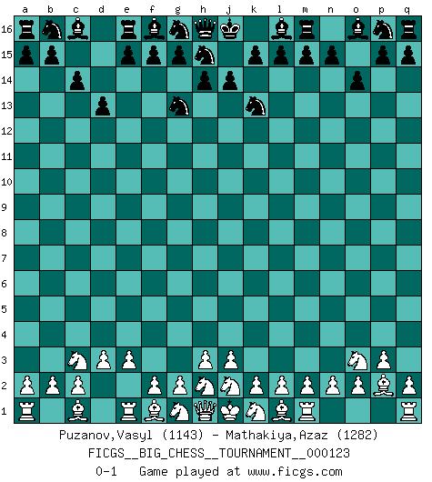 Last move : 0-1 2020 May 18 15:26:13 [Event "FICGS__BIG_CHESS__TOURNAMENT__000123"] [Site "FICGS"] [Date "2020.04.10"] [Round "1"] [White "Puzanov,Vasyl"] [Black "Mathakiya,Azaz"] [Result "0-1"] [WhiteElo "1143"] [BlackElo "1282"] 1.p2-p3 j15-k13 2.p1-o3 h15-g13 3.o1-p2 k16-h15 4.b1-c3 c15-c14 5.d2-d3 o15-o14 6.e2-e3 d15-d13 0-1 This big chess game has been lost on time (started : 2020.04.10 21:4:41) Follow this game move after move (download)Why must I lose to this idiot ? (Aron Nimzovich) Um sich vor der Gefahr einer Erkältung zu schützen, sorge der wanderlustige König beizeiten für ein brauchbares Versteck. (Aaron Nimzowitsch) Yo he agregado estos principios a la ley: pongan los Caballos en acción antes de que los dos Alfiles sean desarrollados. (Emanuel Lasker) L'ordinateur a tué l'originalité. Il n'y a plus guère d'aventures sur l'échiquier. (Jacob Murray) Perhaps chess is the wrong game for the times (The Chess Master and the Computer, by Garry Kasparov - 2010)