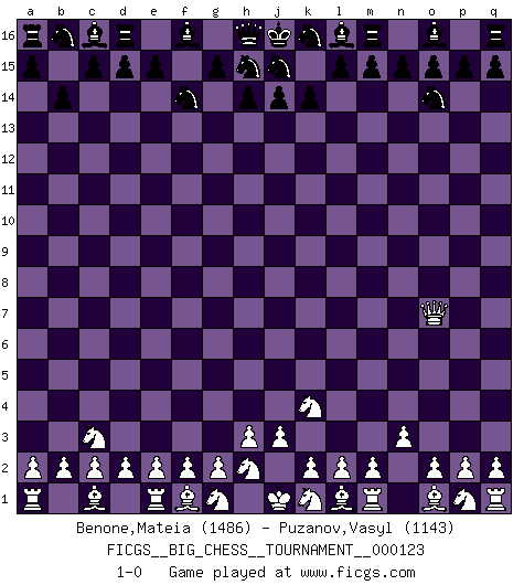 Last move : 1-0 2020 May 16 22:21:28 [Event "FICGS__BIG_CHESS__TOURNAMENT__000123"] [Site "FICGS"] [Date "2020.04.10"] [Round "1"] [White "Benone,Mateia"] [Black "Puzanov,Vasyl"] [Result "1-0"] [WhiteElo "1486"] [BlackElo "1143"] 1.j2-k4 b15-b14 2.h1-o7 p16-o14 3.o7-f15 e16-d16 4.b1-c3 g16-f14 5.f15-o7 k15-k14 6.n2-n3 1-0 Follow this game move after move (download)The most important feature of the Chess position is the activity of the pieces. This is absolutely fundamental in all phases of the game: Opening, Middlegame and especially Endgame. The primary constraint on a piece's activity is the Pawn structure. (Michael Stean) Der vorletzte Fehler gewinnt. (Savielly Grigorievitsch Tartakower) Sin errores no puede haber brillantez. (Emanuel Lasker) Dans le domaine de la peinture, de la gravure et de la sculpture, dès la première décennie de notre siècle, les artistes abandonnent la représentation de la partie d'échecs pour se concentrer sur les pièces, sur les échiquiers et sur toutes les variations auxquelles les unes et les autres peuvent donner lieu. On passe en quelque sorte d'un thème social à un thème musical (au sens de la musica médiévale, c'est-à-dire d'une notion qui inclue le rythme, l'harmonie, la construction et la déconstruction, etc.). Graphiquement et picturalement, l'échiquier apparaît comme une structure ouverte, dynamique, d'une richesse infinie, autorisant toutes les combinatoires et débouchant sur des mouvements et des rythmes de nature exponentielle. (Michel Pastoureau) The mind is like a parachute, it only functions when its open. (Unknown)